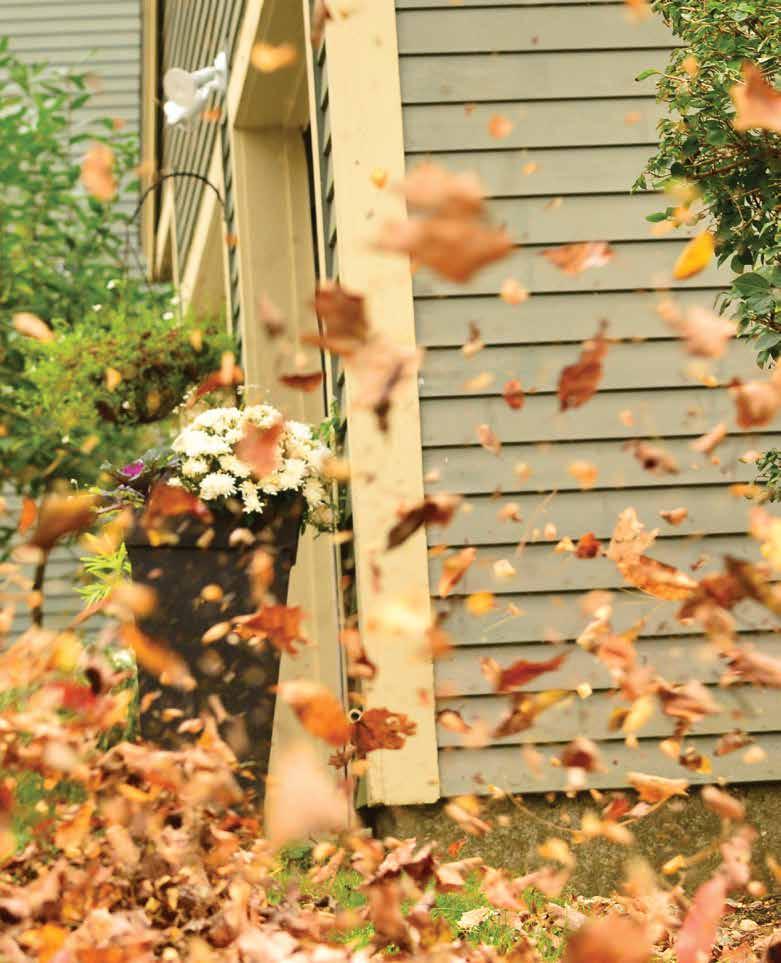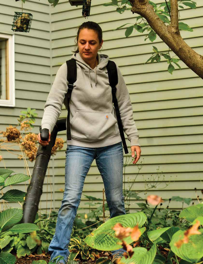 Previous and this page: Danielle Lacroix, the owner of Green Mountain Gardening in Brattleboro, clears leaves from a client’s garden.