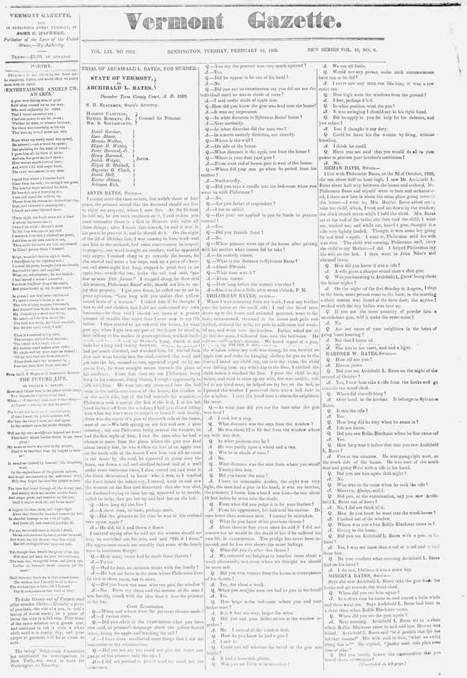 Vermont Gazette via newspapers.com Clippings from the Vermont Gazette from Feb. 12, 1839, on the slaying of Harriet Jane Bates.
