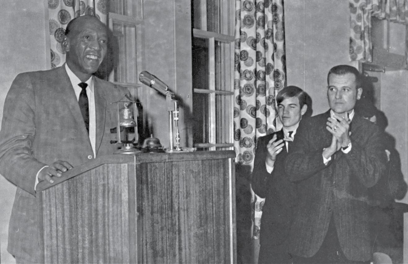 Jesse Owens speaking at the Fall Athletics Banquet in 1965. Also pictured is John Taussig ’69, a third former assigned as waiter to the head table, and Athletic Director Jack Stewart, who became friends with Owens and helped him with the Jesse Owens Foundation.