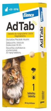 NAZWA WETERYNARYJNEGO PRODUKTU LECZNICZEGO AdTab 12 mg tabletki do rozgryzania i żucia dla kotów (0,5–2,0 kg) | AdTab 48 mg tabletki do rozgryzania i żucia dla kotów (>2,0–8,0 kg). SKŁAD JAKOŚCIOWY I ILOŚCIOWY Substancja czynna: Każda tabletka do rozgryzania i żucia zawiera: Białe do brązowawych okrągłe tabletki do rozgryzania i żucia z brązowawymi plamkami. Wskazania lecznicze dla każdego z docelowych gatunków zwierząt Leczenie inwazji pcheł i kleszczy u kotów. Ten produkt leczniczy weterynaryjny wykazuje natychmiastowe i trwające 1 miesiąc działanie bójcze wobec pcheł (Ctenocephalides felis i C. canis) oraz kleszczy (Ixodes ricinus).Pchły i kleszcze muszą znajdować się na zwierzęciu i rozpocząć odżywianie w celu kontaktu z substancją czynną. NAZWA PODMIOTU ODPOWIEDZIALNEGO Elanco GmbH. Przed użyciem zapoznaj się z treścią ulotki dołączonej do opakowania.