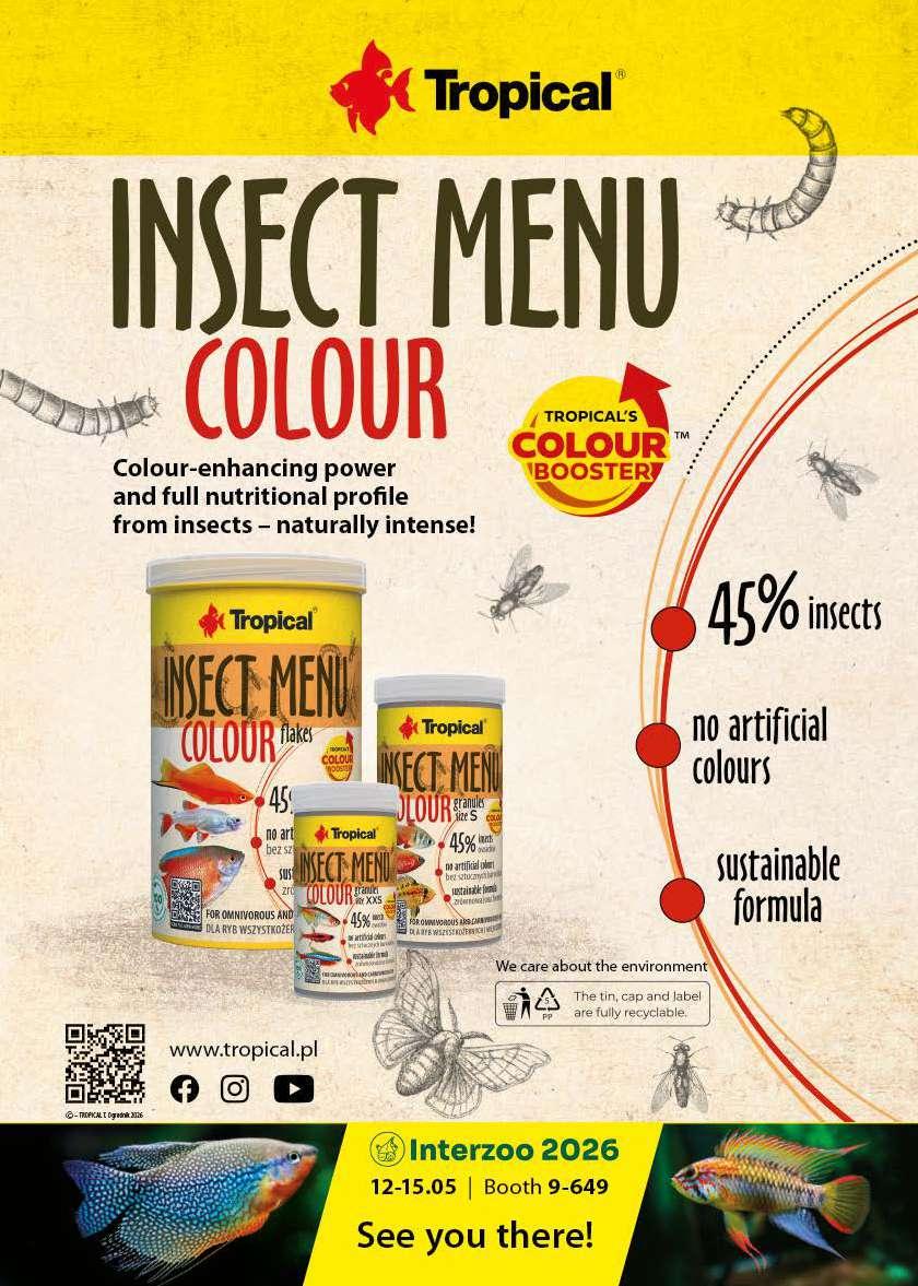 Wybarwiający pokarm dla wszystkożernych i mięsożernych ryb akwariowych na bazie trzech owadów: hermetii (15%), jedwabnika (15%) i mącznika młynarka (15%), z formułą Tropical’s Colour Booster. Pokarm dostępny jest w formie płatków oraz granulatu w rozmiarze S i XXS.
