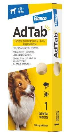 NAZWA WETERYNARYJNEGO PRODUKTU LECZNICZEGO AdTab 56 mg tabletki do rozgryzania i żucia dla psów (1,3–2,5 kg) | AdTab 112 mg tabletki do rozgryzania i żucia dla psów (>2,5–5,5 kg) | AdTab 225 mg tabletki do rozgryzania i żucia dla psów (>5,5–11 kg) | AdTab 450 mg tabletki do rozgryzania i żucia dla psów (>11–22 kg) | AdTab 900 mg tabletki do rozgryzania i żucia dla psów (>22–45 kg). SKŁAD JAKOŚCIOWY I ILOŚCIOWY Substancja czynna: Każda tabletka do rozgryzania i żucia zawiera: Białe do beżowych okrągłe tabletki do rozgryzania i żucia z brązowawymi plamkami. Wskazania lecznicze dla każdego z docelowych gatunków zwierząt Leczenie inwazji pcheł i kleszczy u psów. Ten produkt leczniczy weterynaryjny wykazuje natychmiastowe i trwające 1 miesiąc działanie bójcze wobec pcheł (Ctenocephalides felis i C. canis) oraz kleszczy (Rhipicephalus sanguineus, Ixodes ricinus, I. hexagonus i Dermacentor reticulatus). Pchły i kleszcze muszą znajdować się na zwierzęciu i rozpocząć odżywianie w celu kontaktu z substancją czynną. NAZWA PODMIOTU ODPOWIEDZIALNEGO Elanco GmbH. Przed użyciem zapoznaj się z treścią ulotki dołączonej do opakowania.