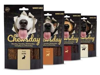 Monday, Sunday, Wednesday… every day is a Chewsday! Uniszki przedstawiają nową linię mięsnych pasków dla psów, stworzoną z myślą o codziennym pysznym żuciu. To aromatyczne i elastyczne przekąski, których struktura angażuje psa na dłużej, dostarczając mu naturalnej satysfakcji z gryzienia.