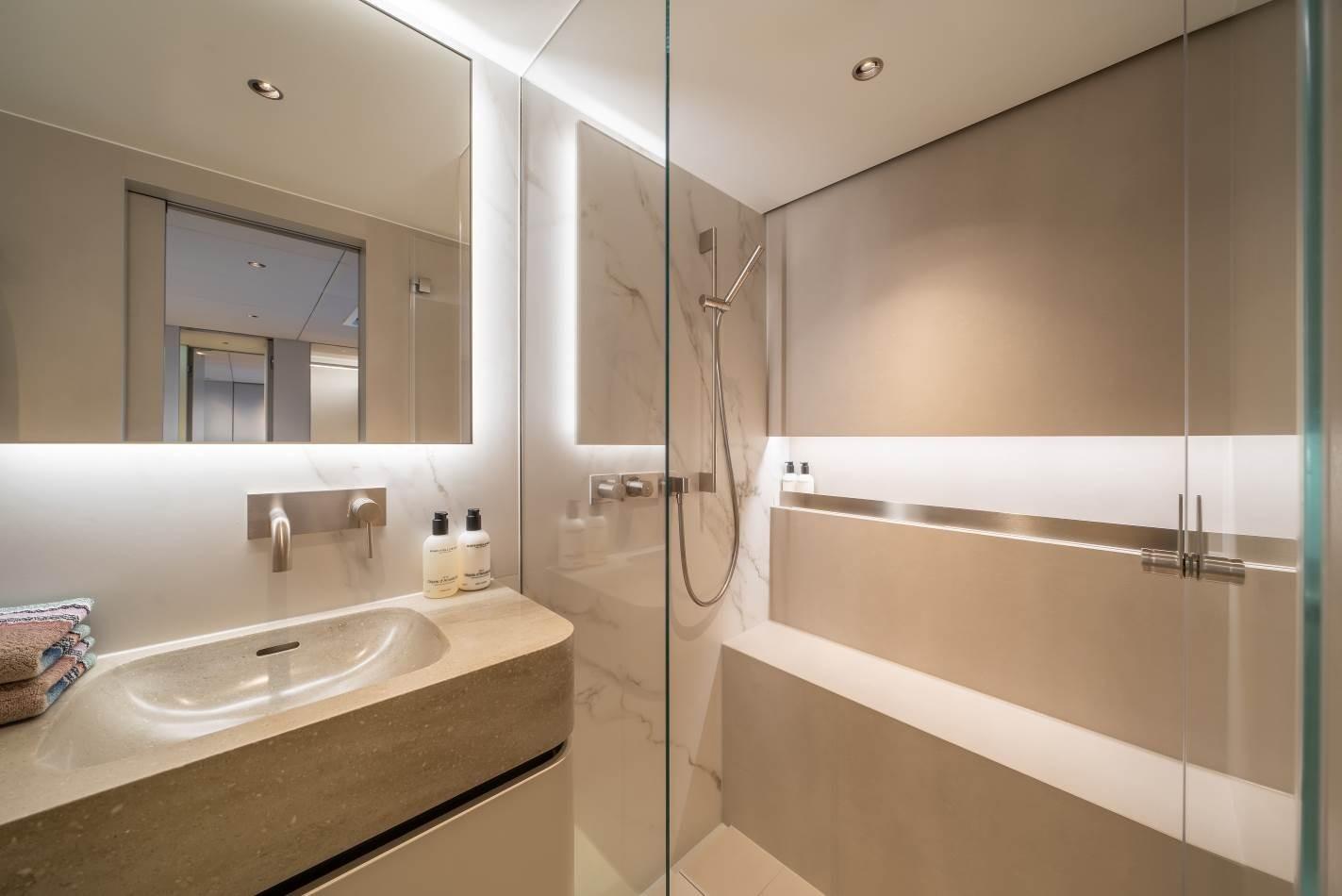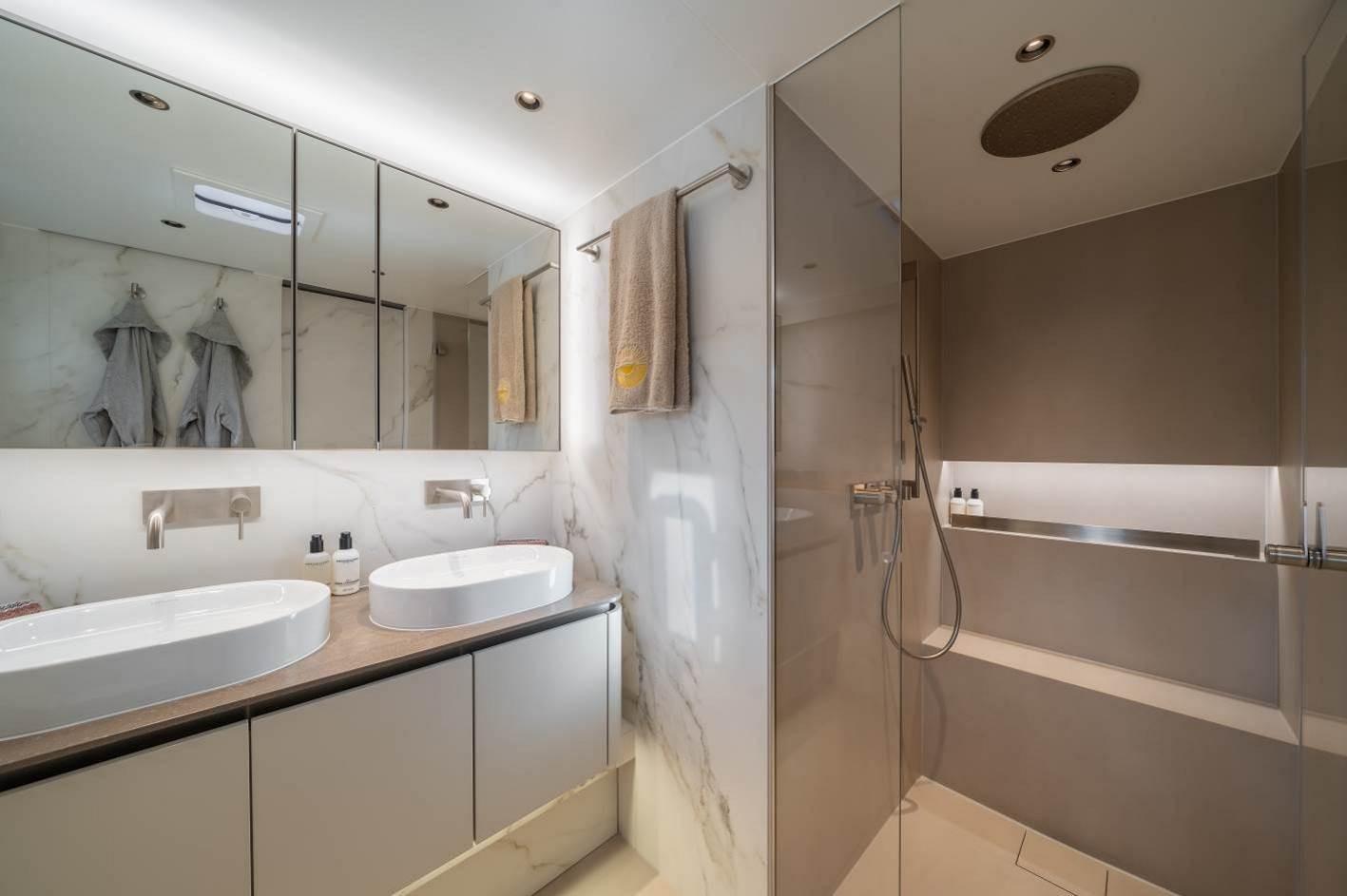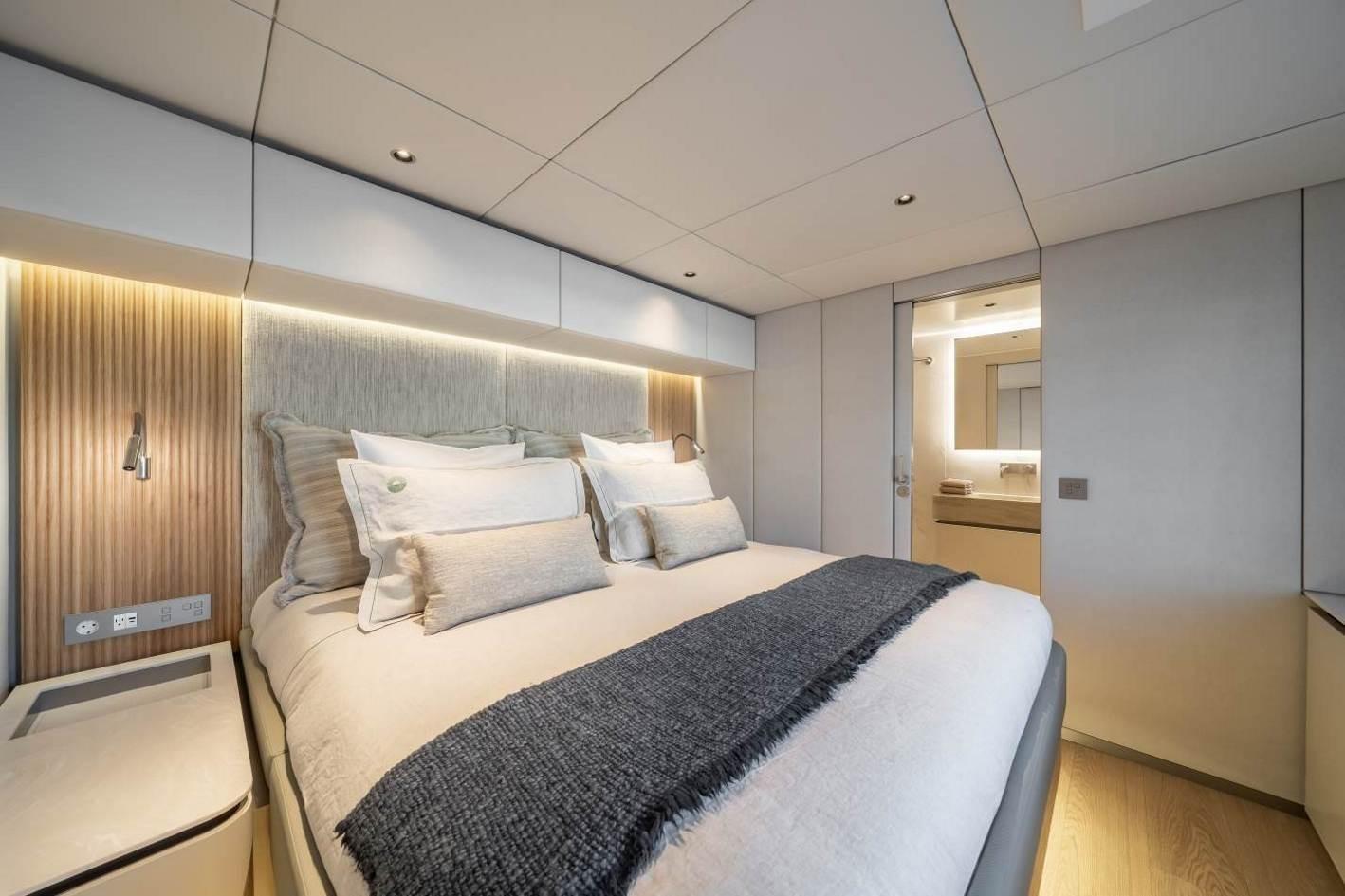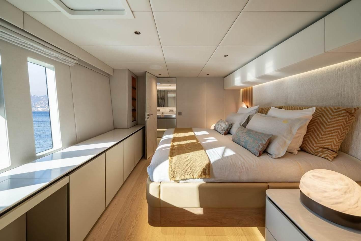 4 spacious cabins, including a luxurious master suite with a walk-in dressing area, desk, sofa, retractable TV, and an expansive ensuite bathroom.