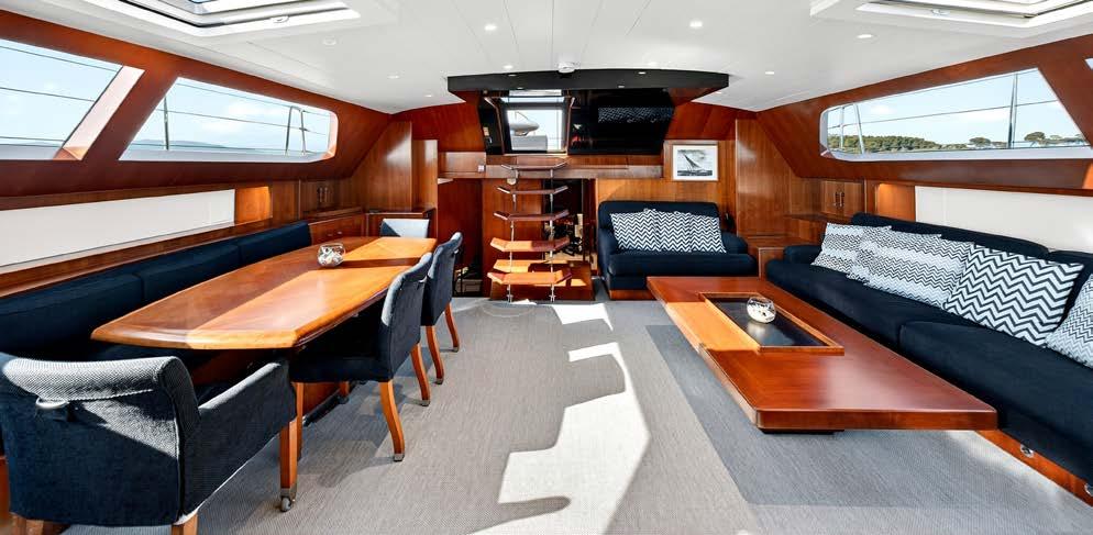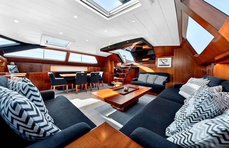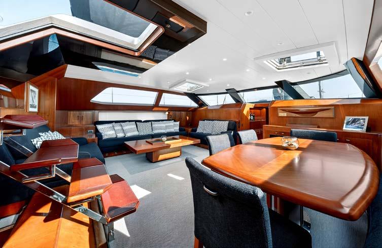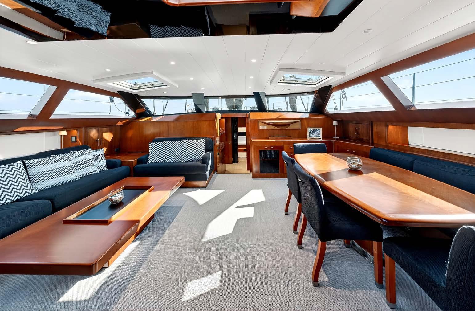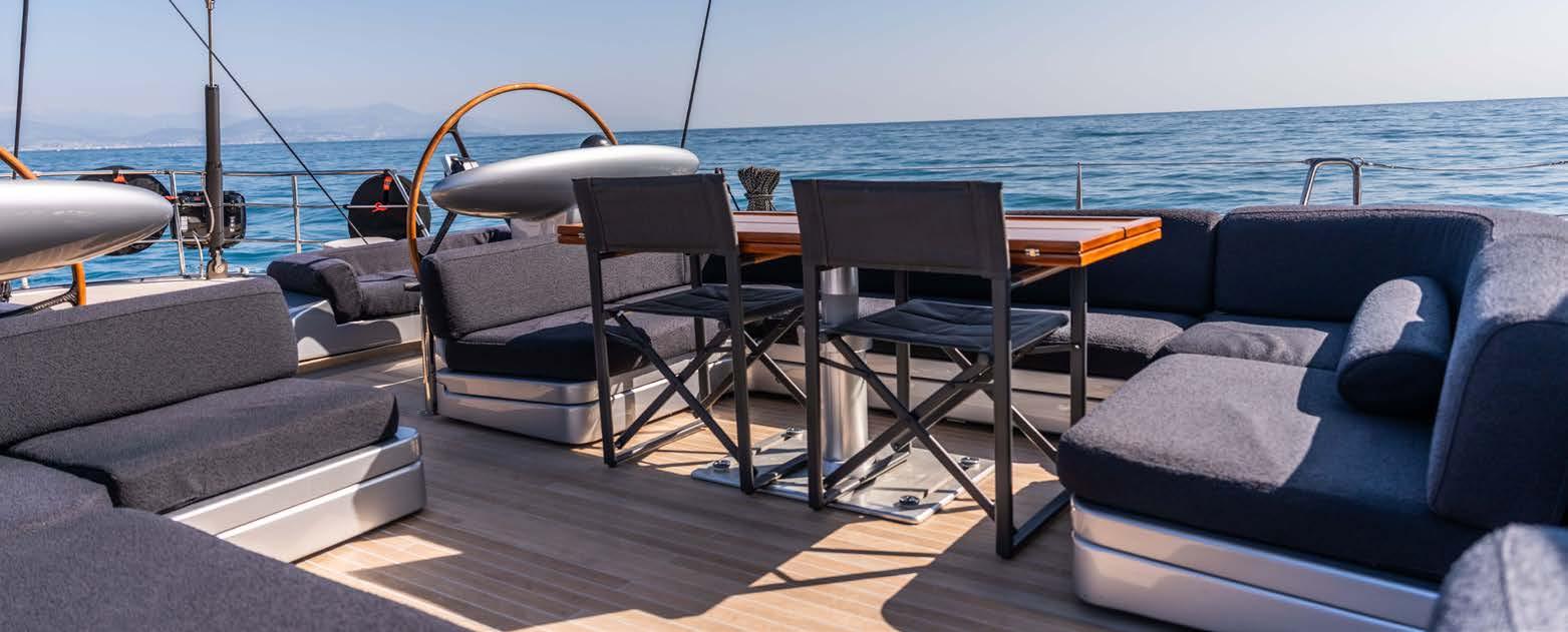 Boarding FREE AT LAST immediately leads to her delightful teak flush deck, featuring U-shaped sofas and two large steering wheels at stern. Ideal for both cruising with friends and family as well as competitive regattas, the space is expansive enough for dining al fresco with a relaxed atmosphere. The sofas can be converted into sunbathing areas should guests wish, and become shaded by awnings to protect from midday heat.