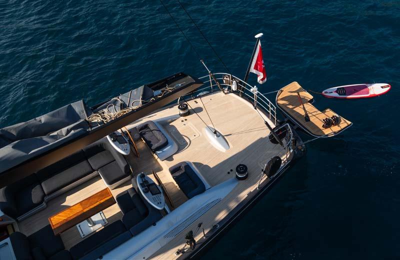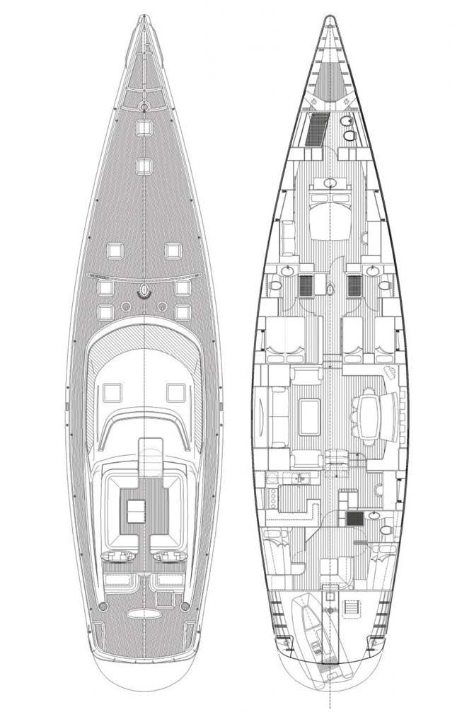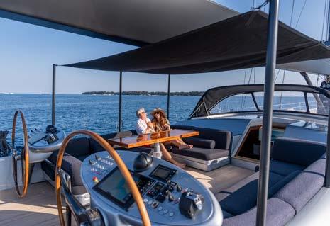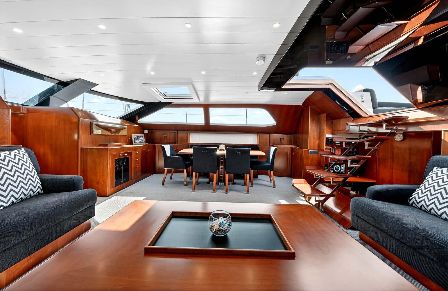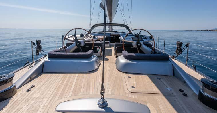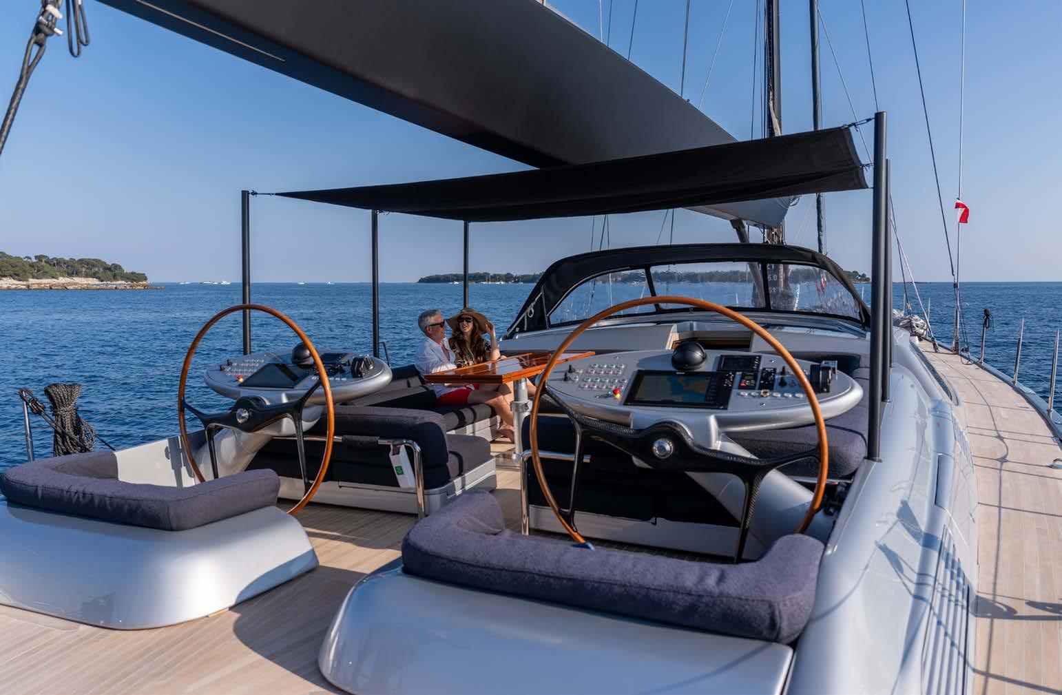 Boarding FREE AT LAST immediately leads to her delightful teak flush deck, featuring U-shaped sofas and two large steering wheels at stern. Ideal for both cruising with friends and family as well as competitive regattas, the space is expansive enough for dining al fresco with a relaxed atmosphere. The sofas can be converted into sunbathing areas should guests wish, and become shaded by awnings to protect from midday heat.