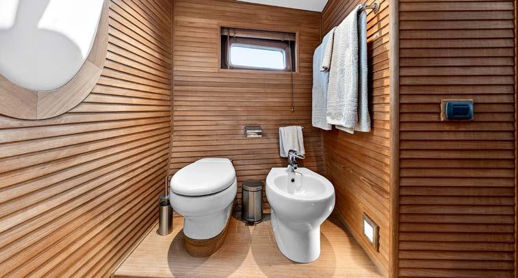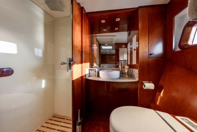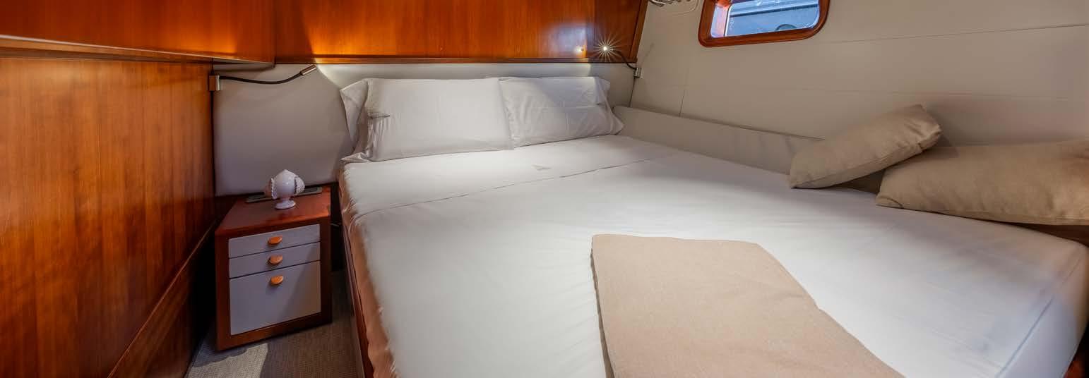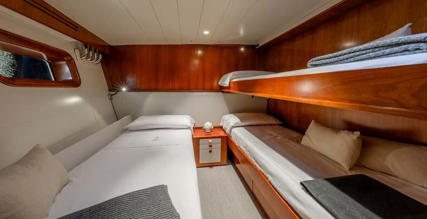 Each featuring an ensuite bathroom, the cabins consist of one spacious master cabin and two convertible guest cabins (twin or double) ; both have a pullman bed.