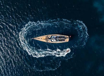 FREE AT LAST boasts a large open space within the interior, creating a cosy atmosphere through warm wooden decor and blue fabrics. A dining table is suitable for meals on board thanks to the abundance of natural light through large portholes and ceiling hatches. The space leads to the 2 guest cabins and to the owner’s cabin of FREE AT LAST, all of which can accommodate up to 8 guests.