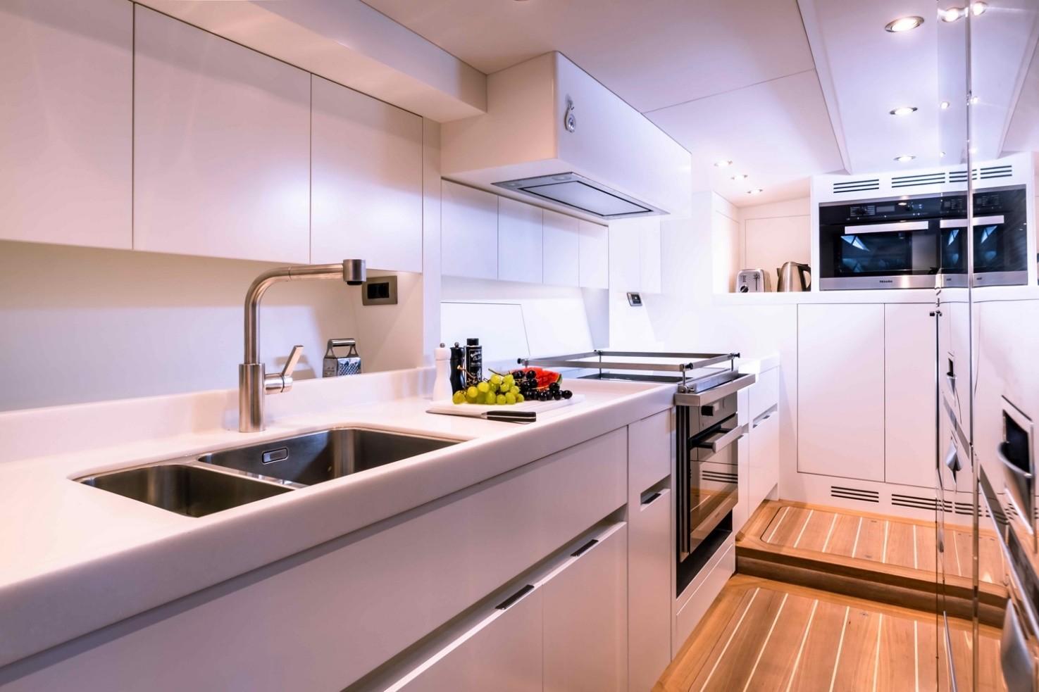 The fully refurbished galley located starboard aft is equipped with all the modern high quality equipment for professional charters.