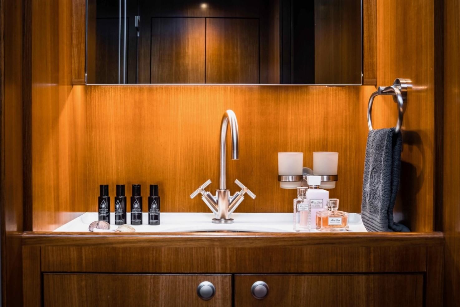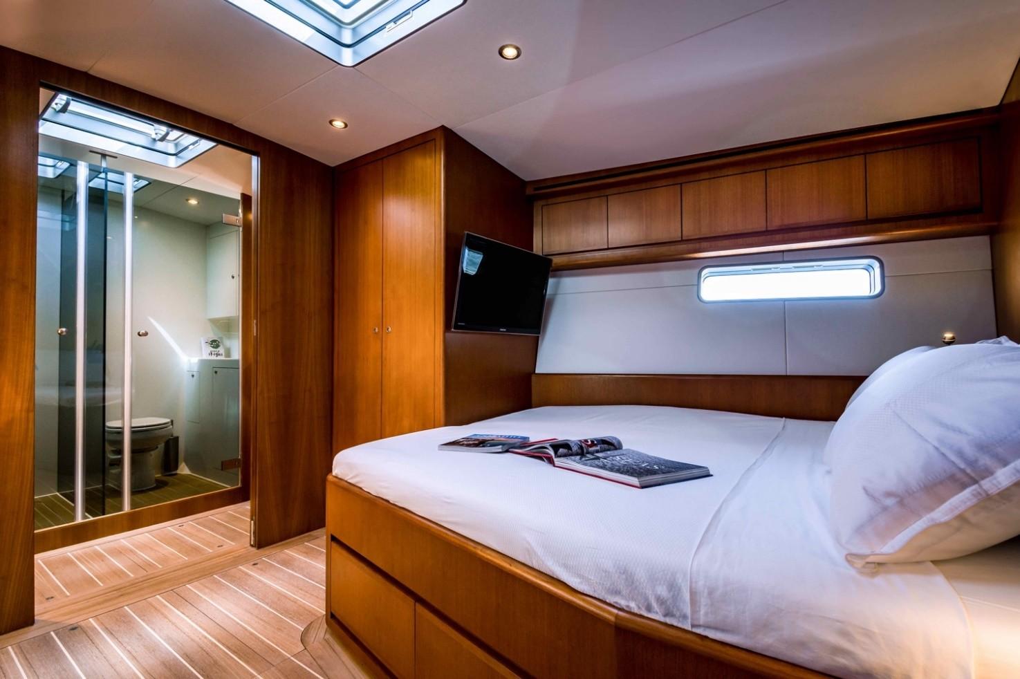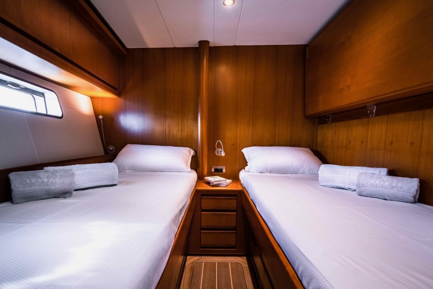 The crew cabin for two is located port aft and has its bathroom