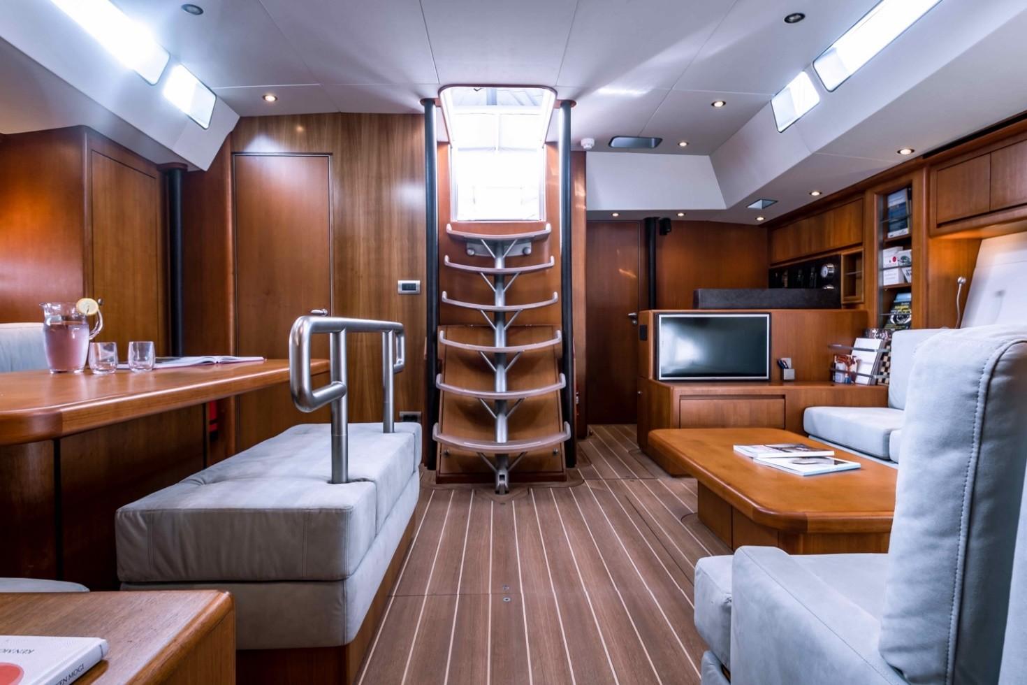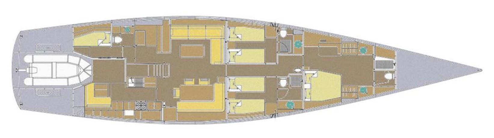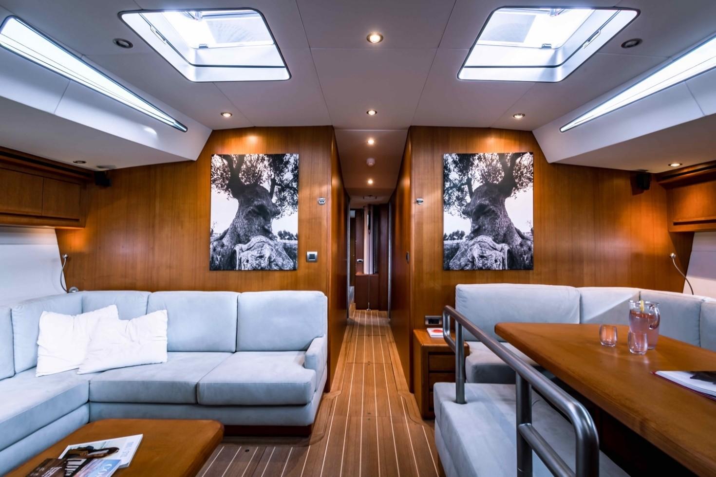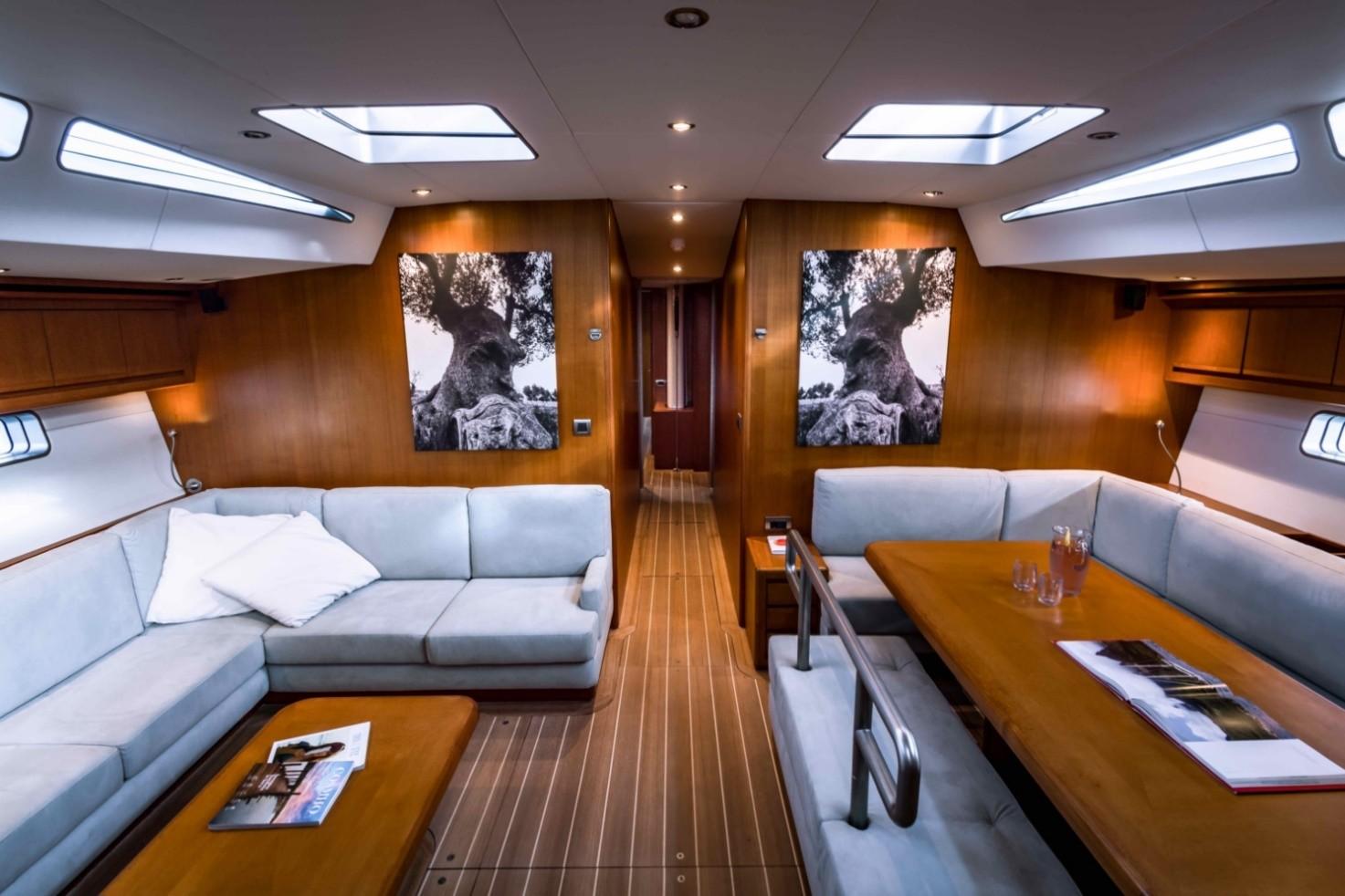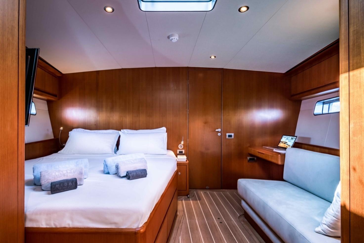 The main saloon offers a comfortable table for 8 guests and a canapé on the port side. The galley is on the starboard aft, and the crew cabin is on the port side. The guests’ cabins are forward, offering more comfort and silence from the engine room and cockpit movements.