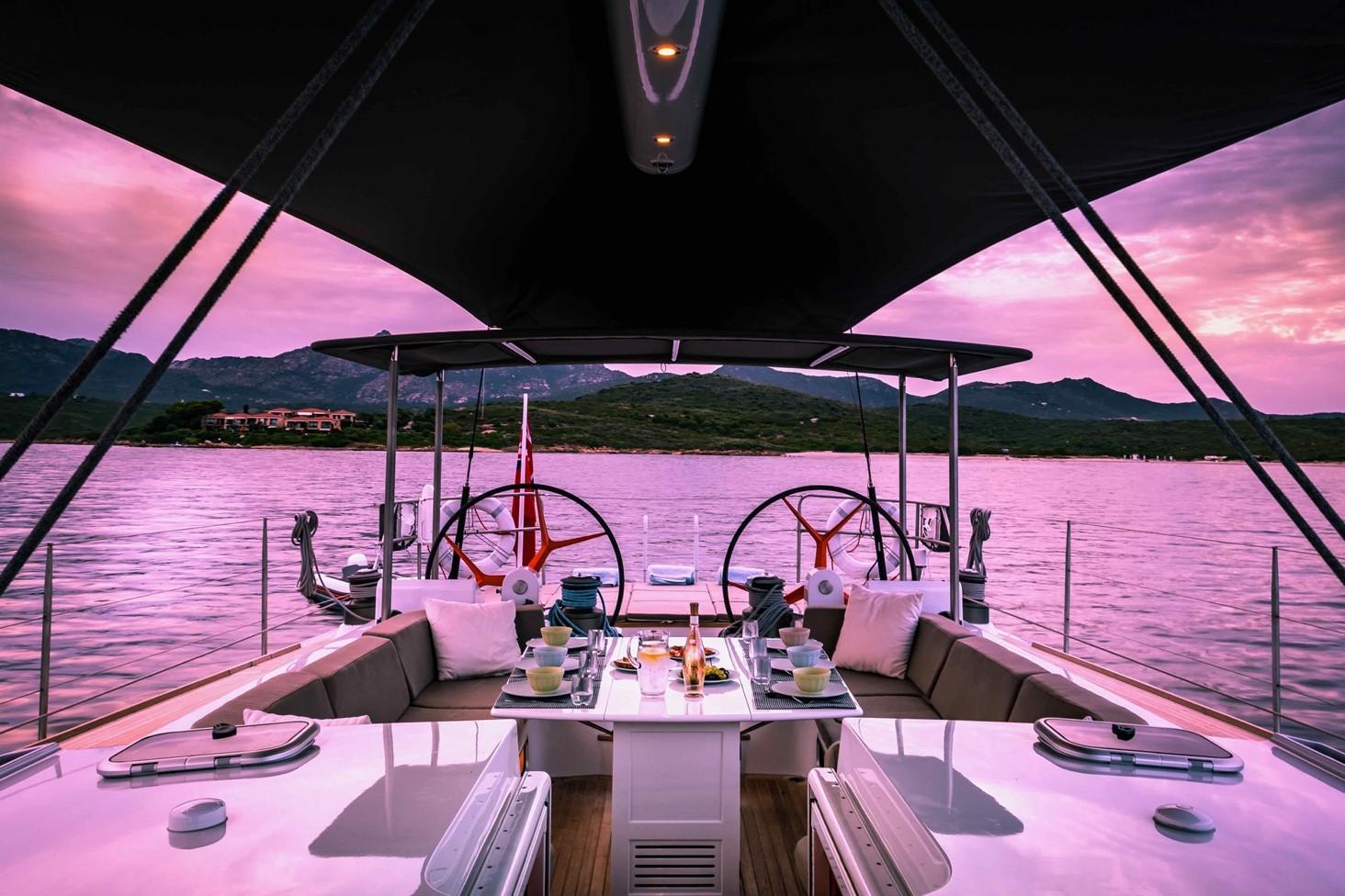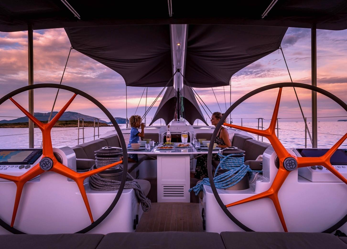 The sleek lines of the Judel/Vrolijk design offers a very flushed deck and a large vision around the cockpit table, although well protected by a retractable spray dodger, a sun awning fit into the boom and a solid permanent sun protection for the helm. The folding cockpit table welcomes comfortably up to 8 guests. There are large sun beds on the aft deck, open to the sea through the large transom door. The twin helm stations have all the navigation equipment and control functions, and winches and sheets are clear of the guest area to ensure full safety.