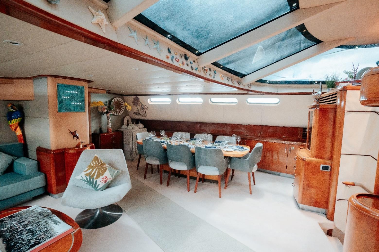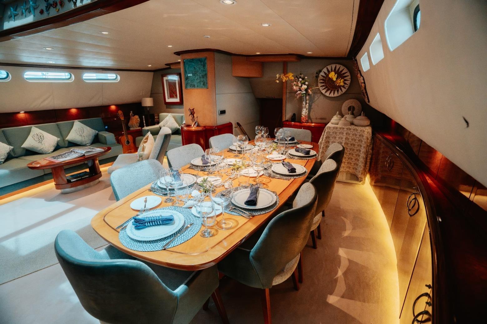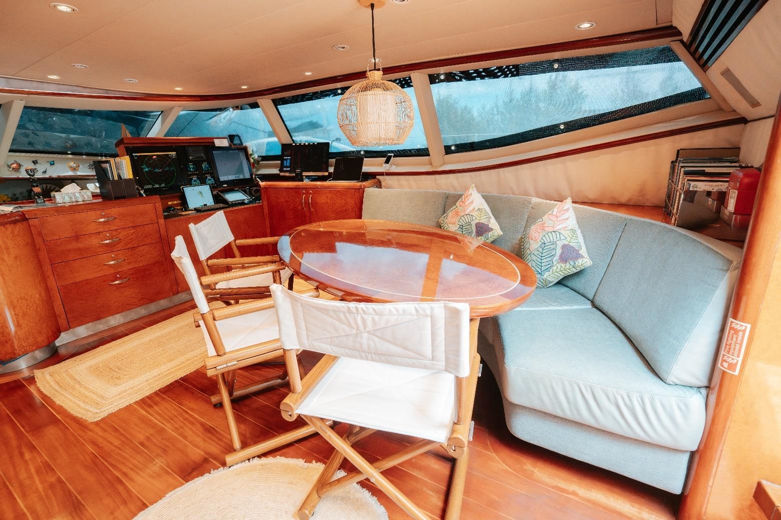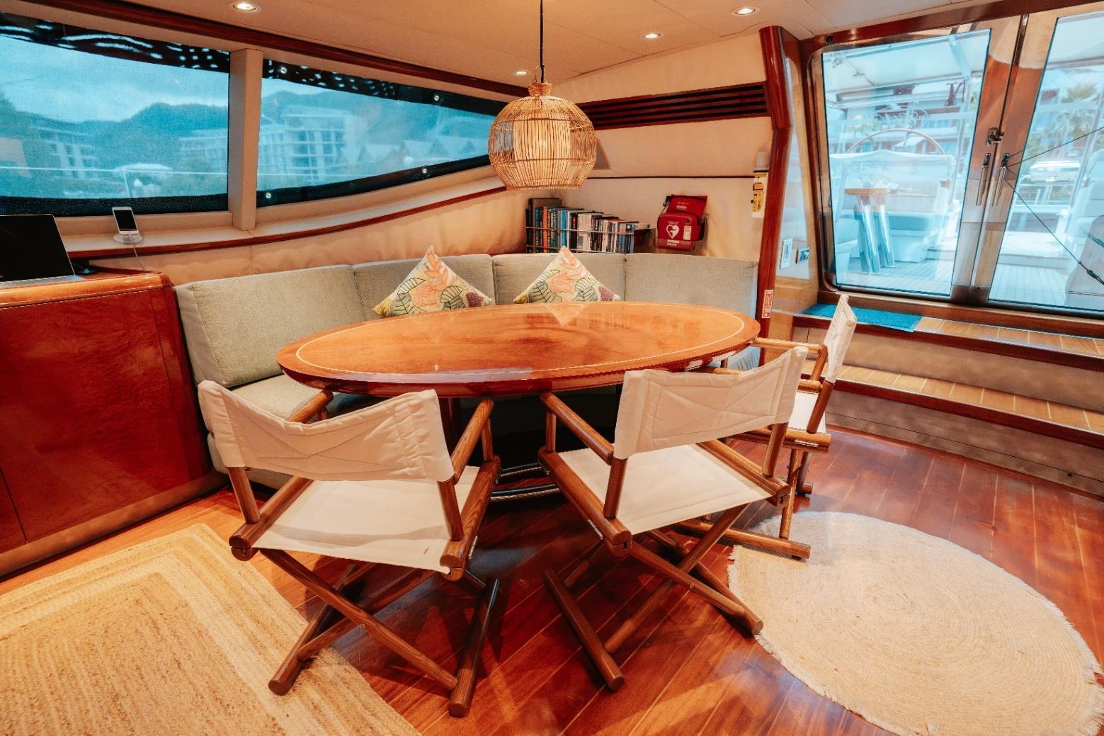 Down below from the deck house, nicely suited with a dining area on starboard, and a salon are on port