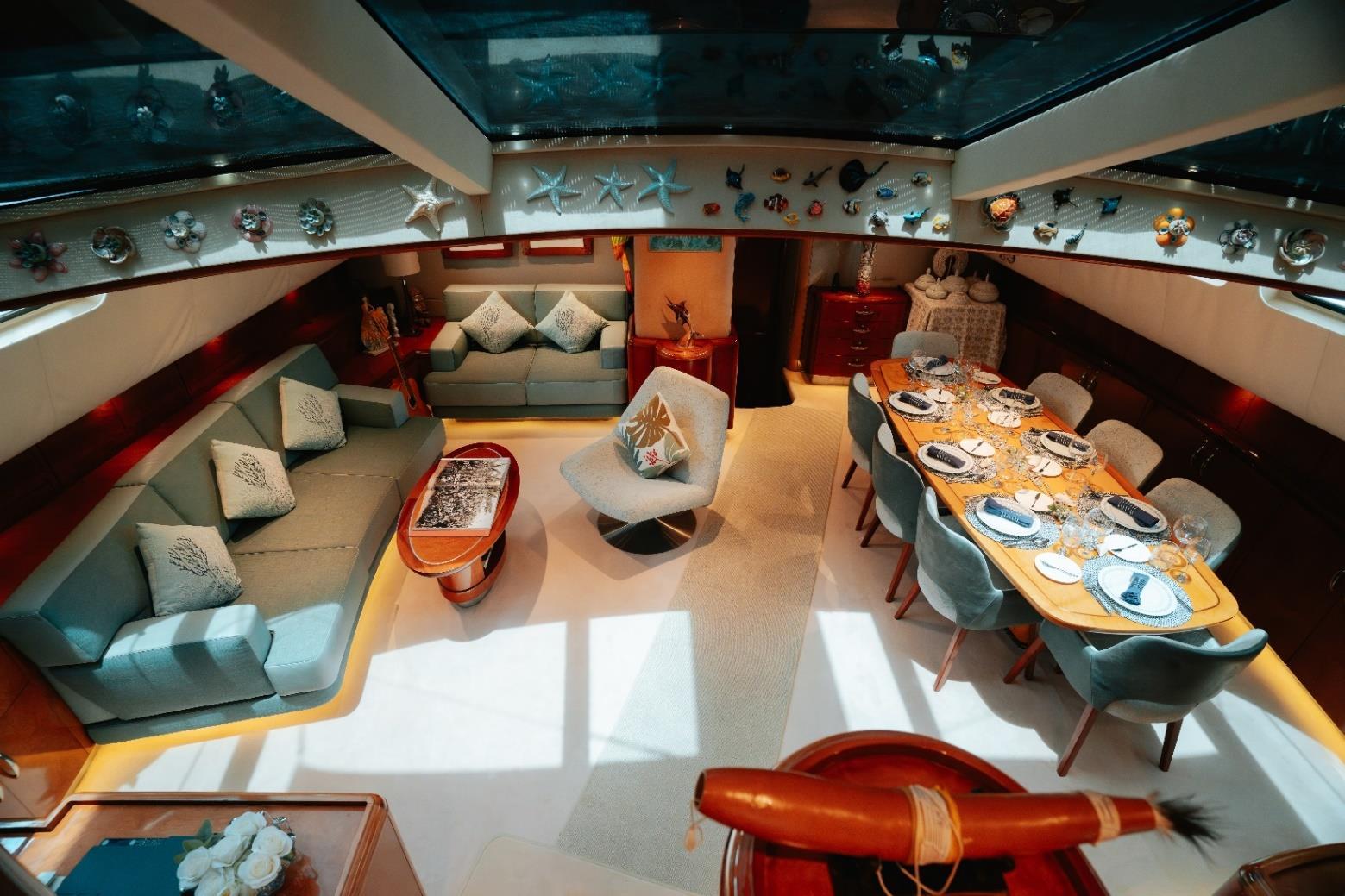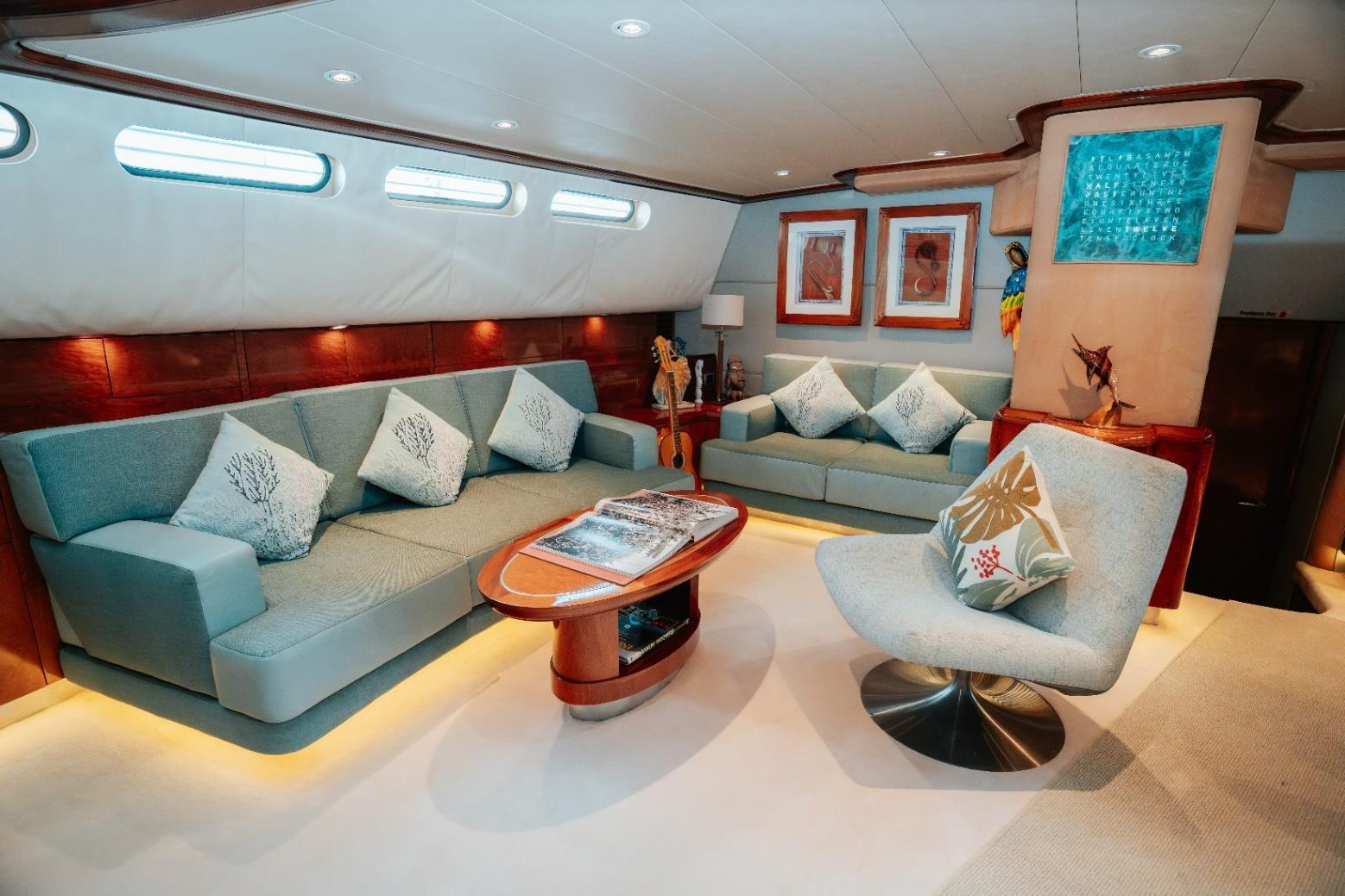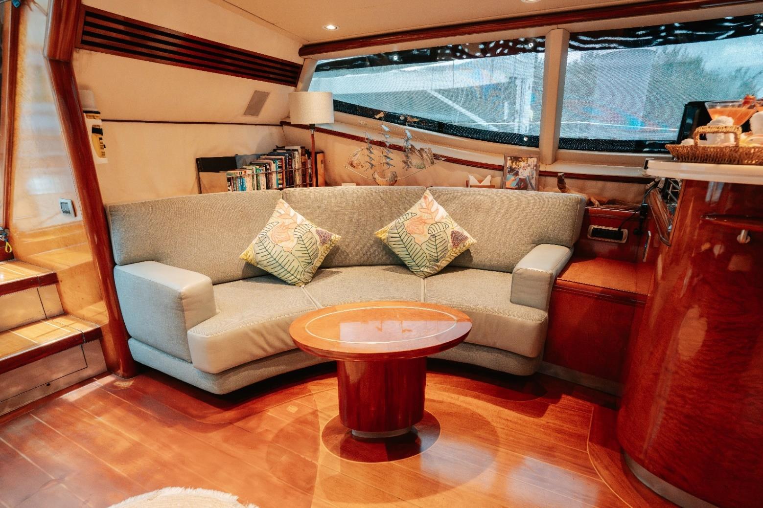 Down below from the deck house, nicely suited with a dining area on starboard, and a salon are on port