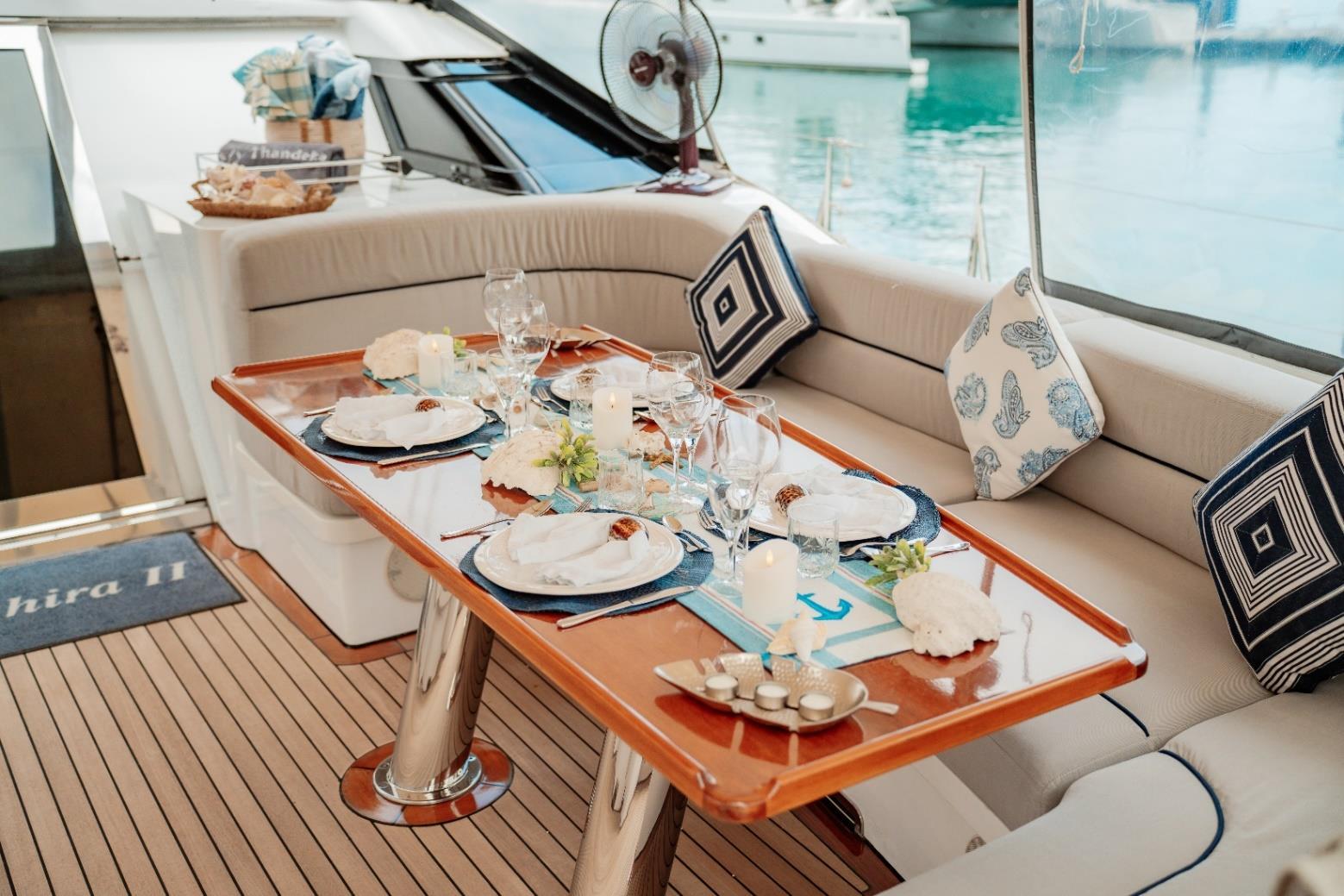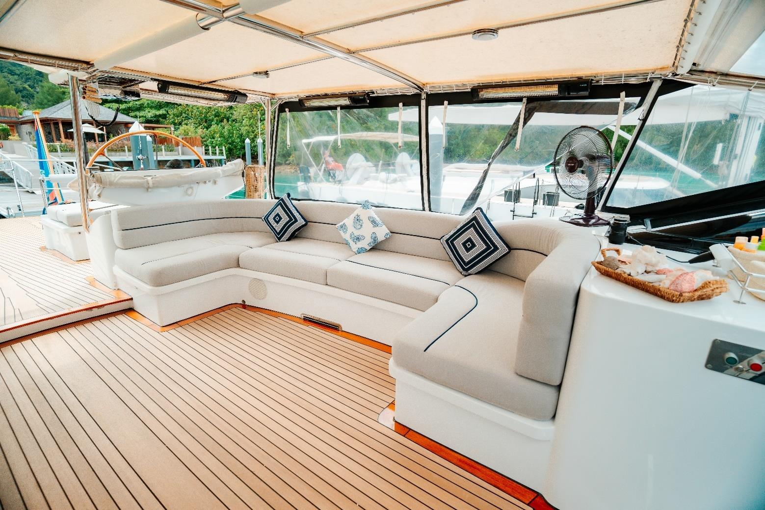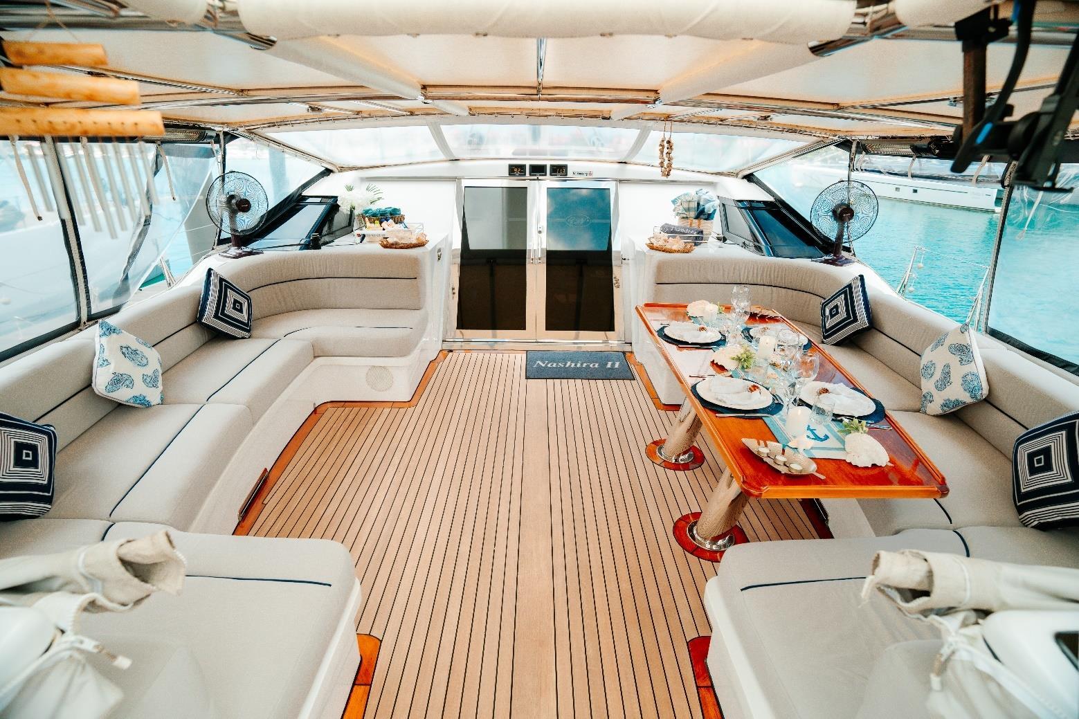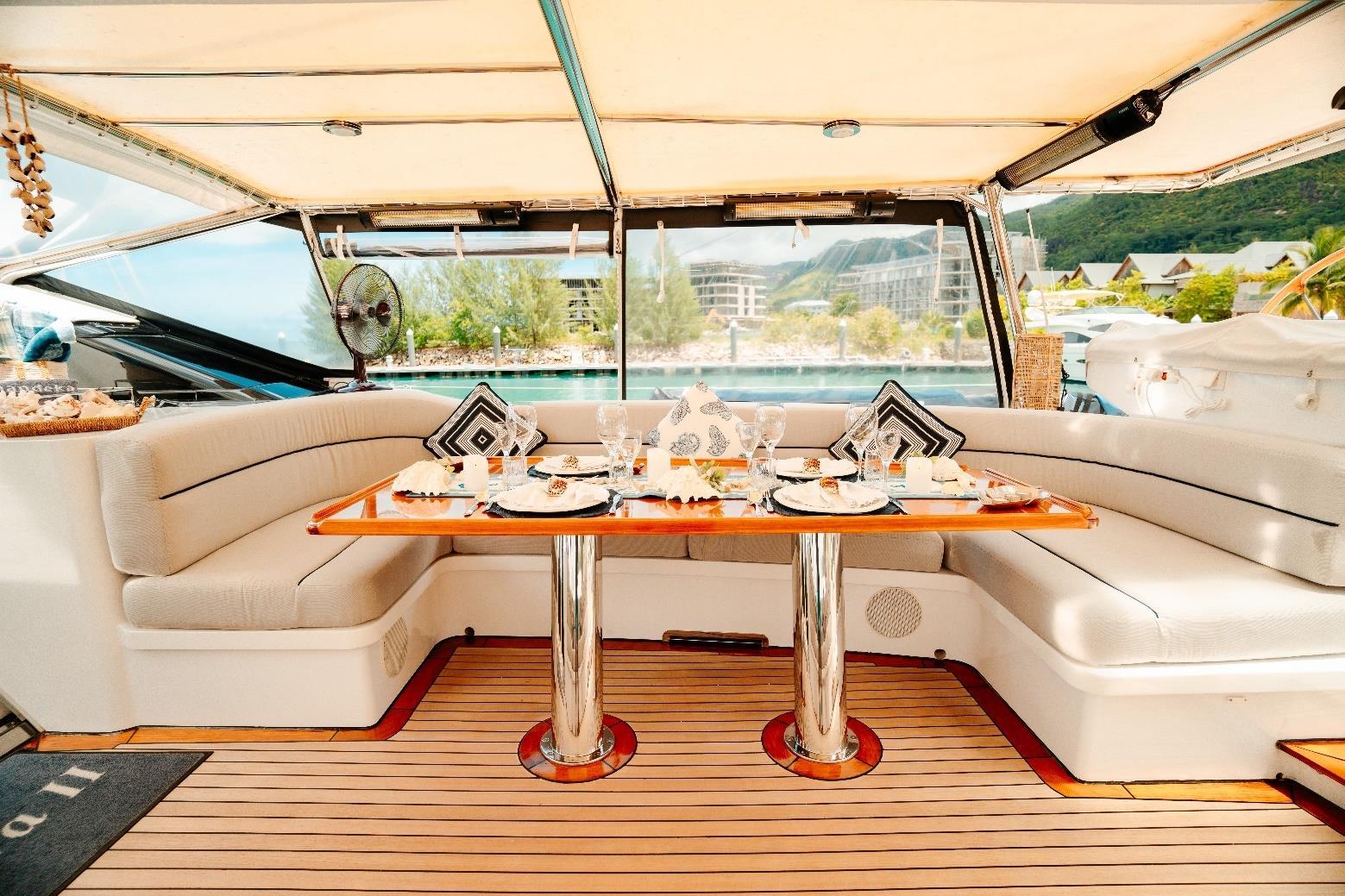 Down below from the deck house, nicely suited with a dining area on starboard, and a salon are on port