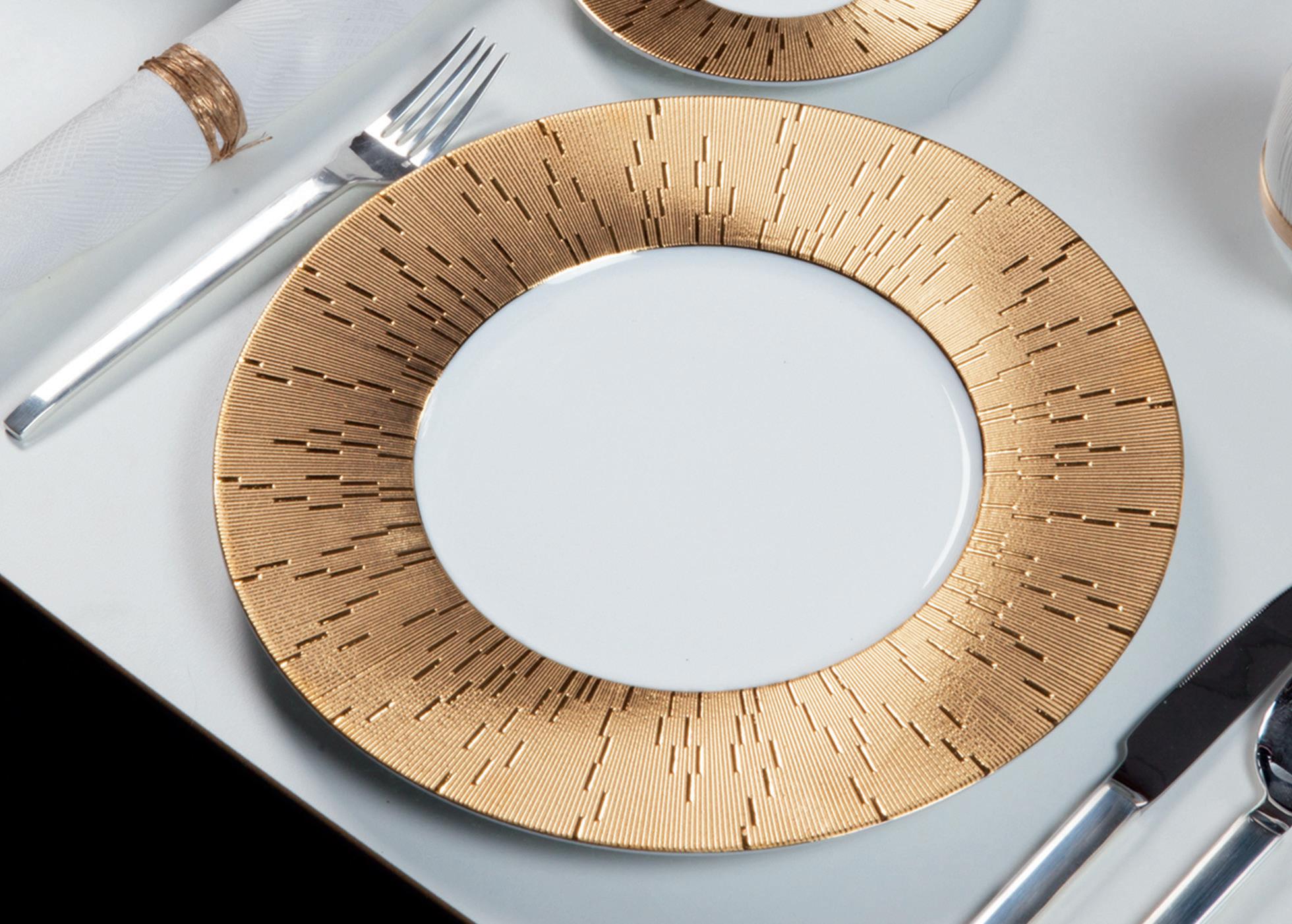 An iconic collection from Maison Haviland, Infini stands out with its delicately engraved hollow pattern. Radiating like the sun, its motif extends endlessly, while subtle sparks reflect movement bringing each piece to life. Infini is adorned with brilliant finishes in gold or platinum, applied by hand by skilled artisans, bringing a luminous and inviting glow to each piece.