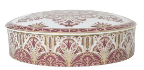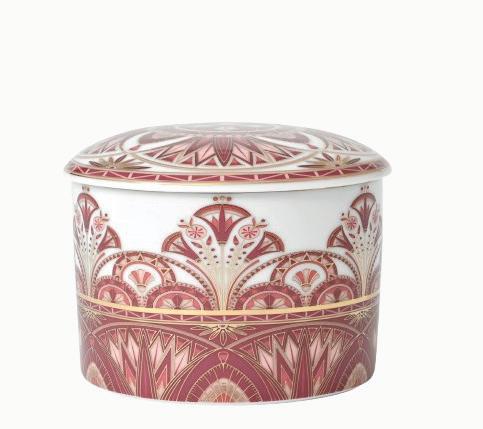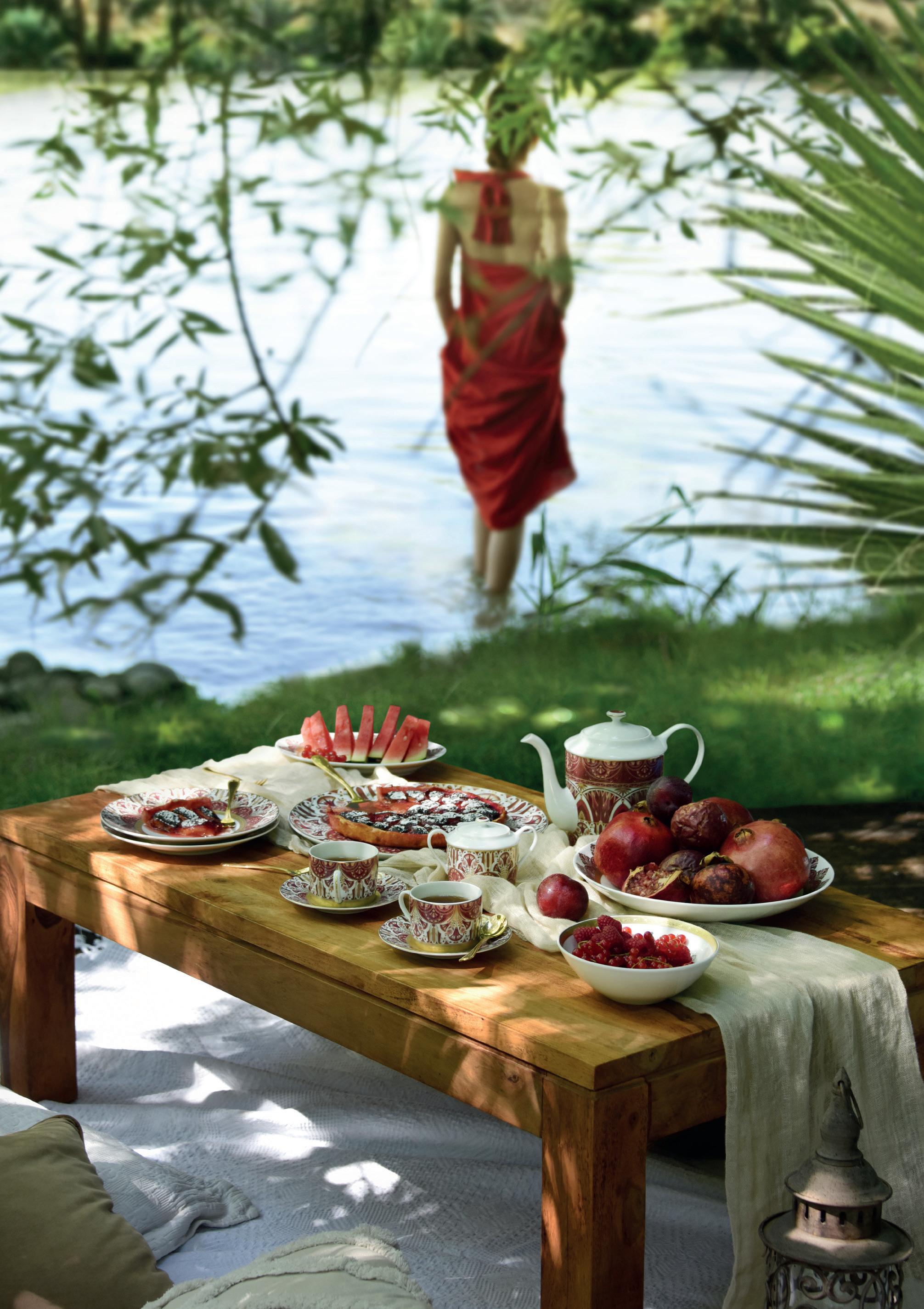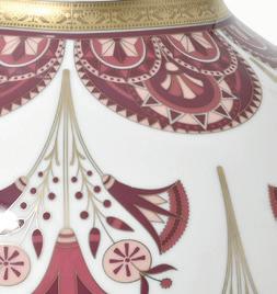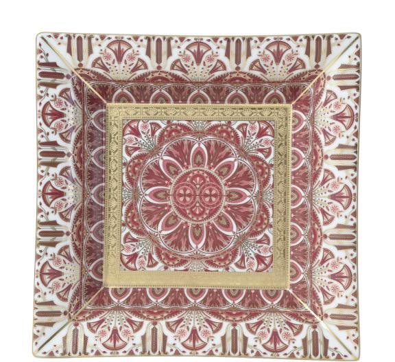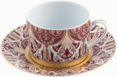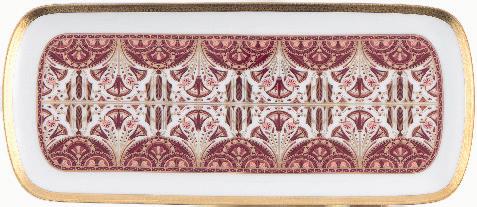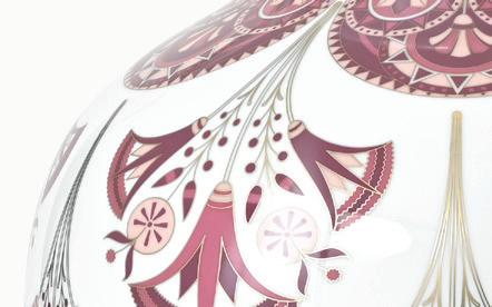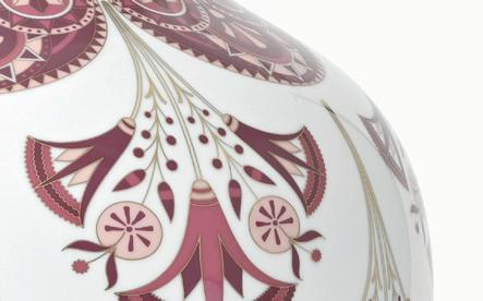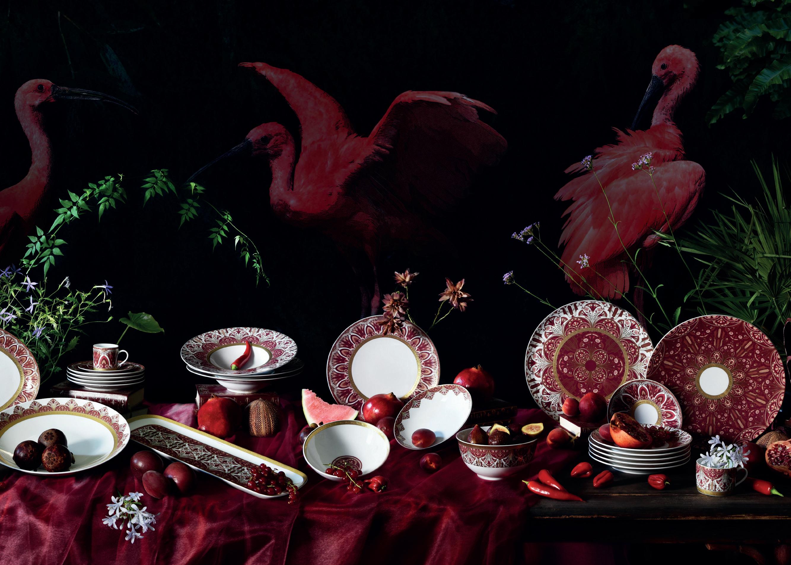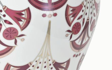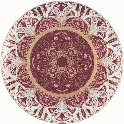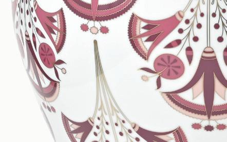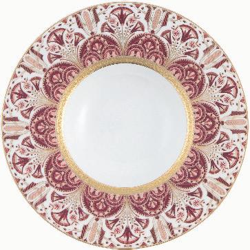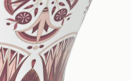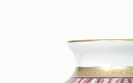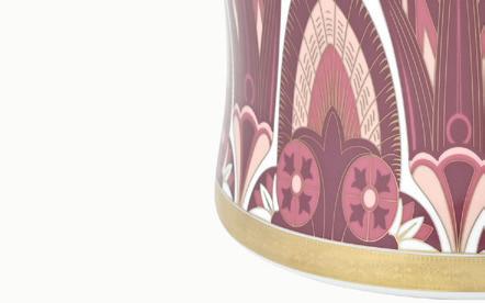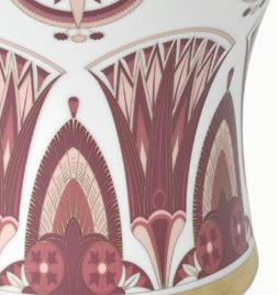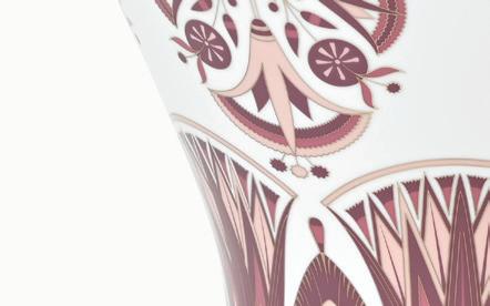 The Rêves du Nil Pourpre collection is revisited with shades that evoke the grandeur and richness of ancient Egypt, highlighted with touches of handapplied gold. Sun drenched papyrus and palm leaves are tinged with reds and pinks, accented by a gold relief frieze, like a finely chiseled line on the horizon. Rêves du Nil Pourpre takes you on a journey along the traces of a legendary civilization.
