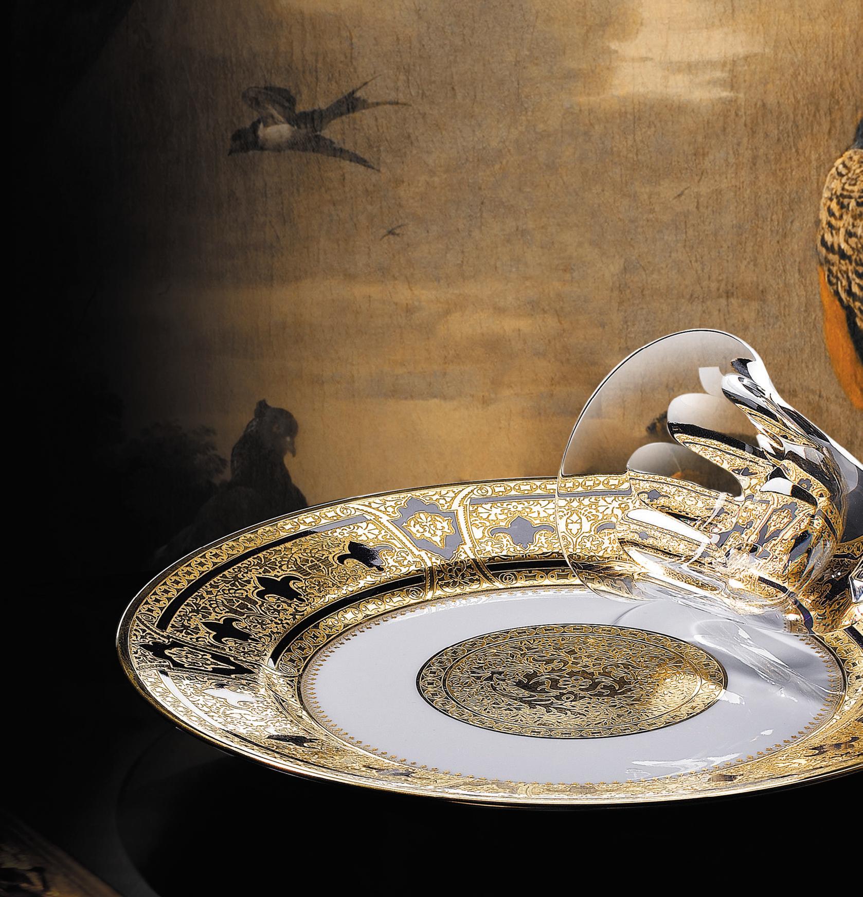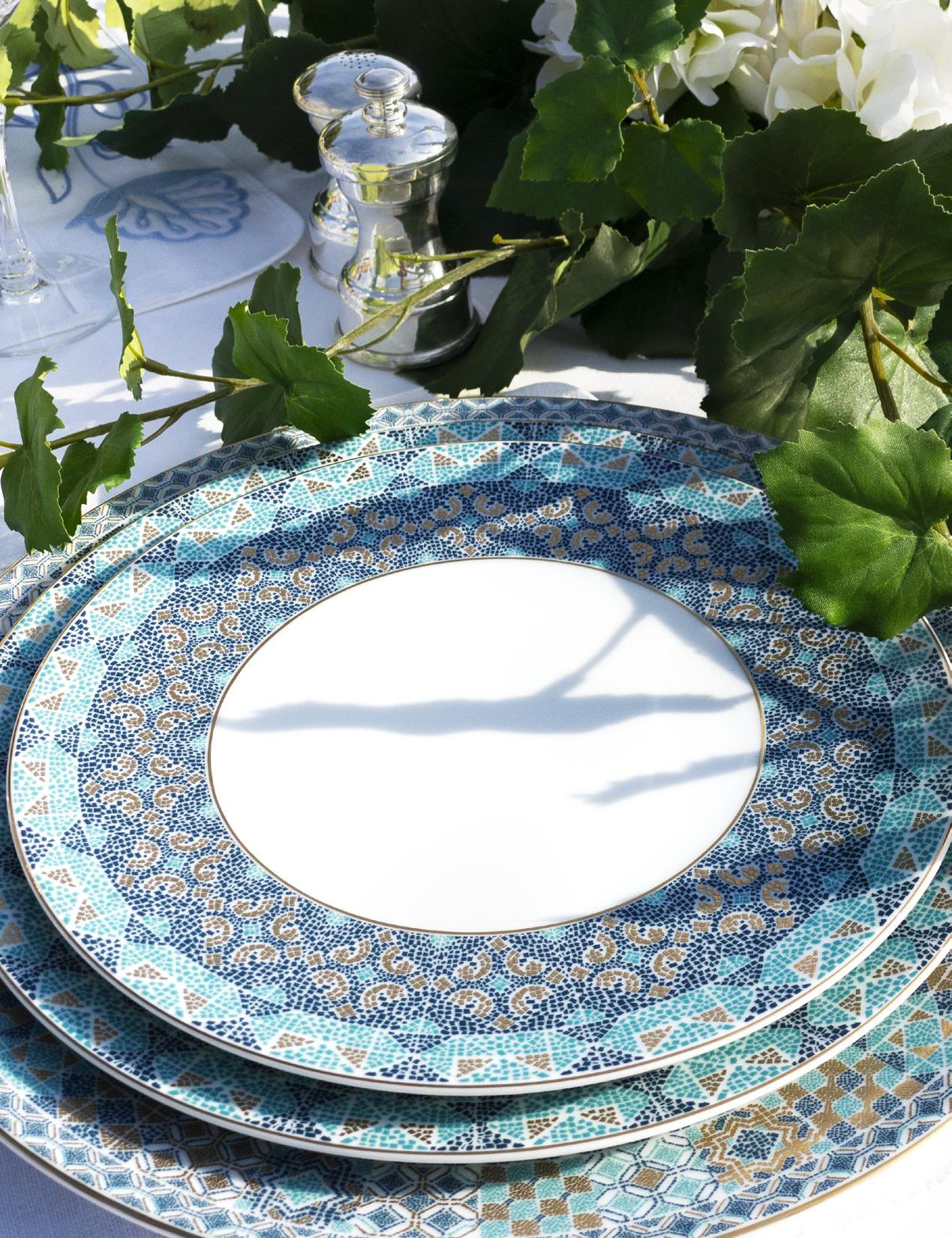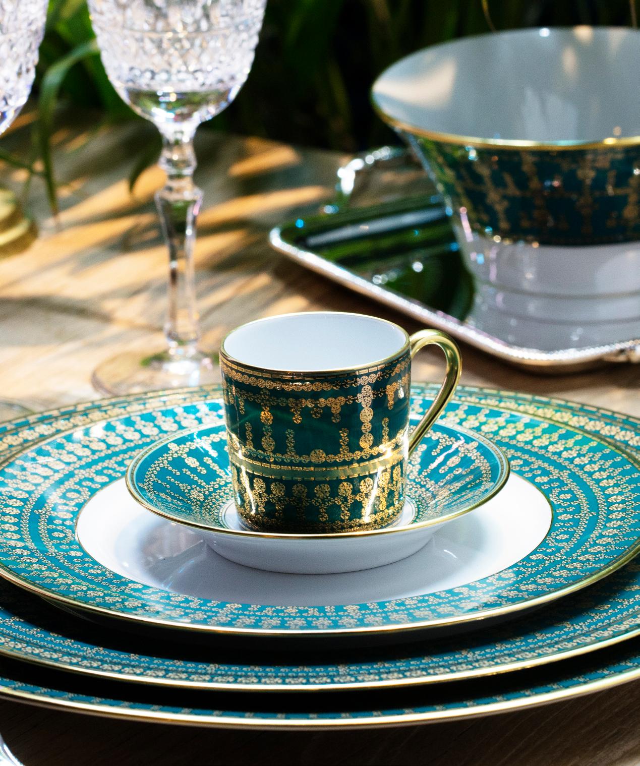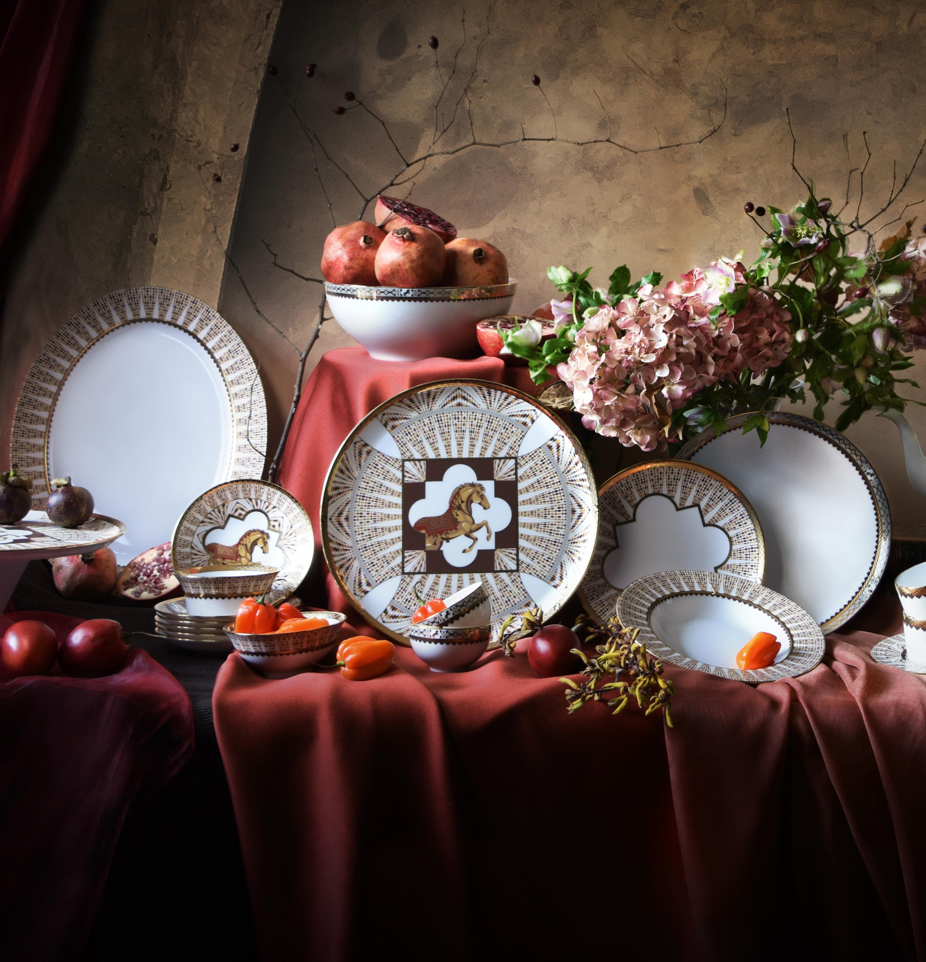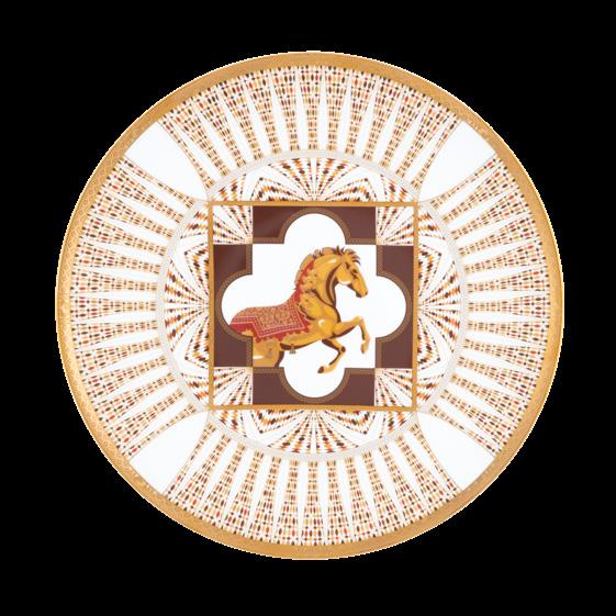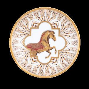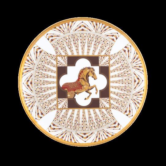The Cavalier Royal collection pays tribute to the nobility and grace of the Andalusian horse, renowned as the horse of kings beloved by European aristocracy. It is featured on the presentation and bread and butter plate in a quadrilobed cartouche that evokes the Alcázar Palace in Seville. The various architectural patterns and the colors of the decoration embody this fusion of East and West, distinctly characteristic of the southern Iberian Peninsula.