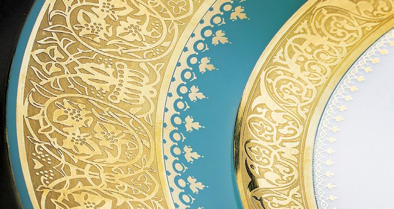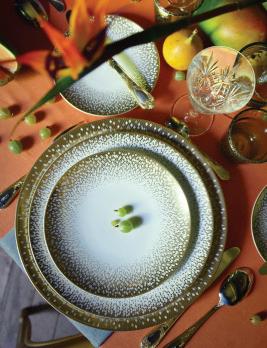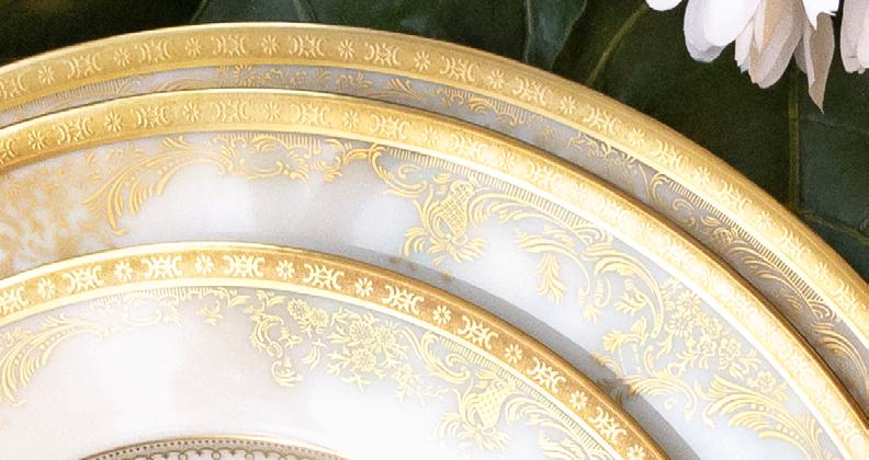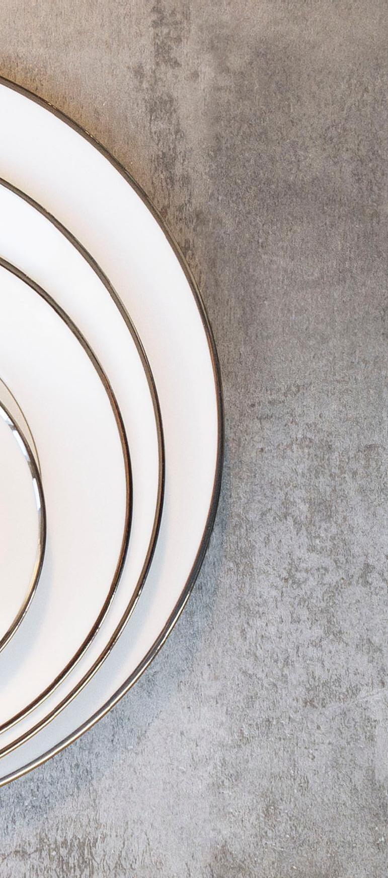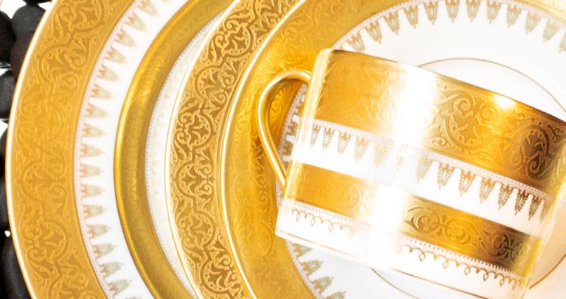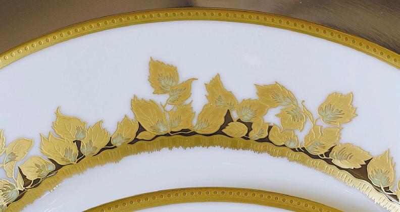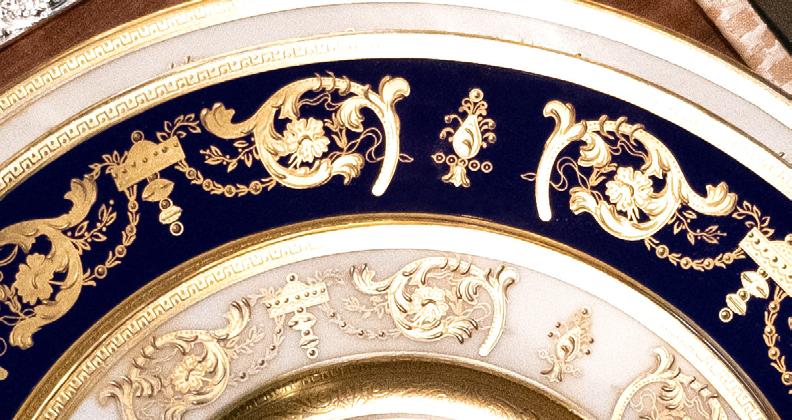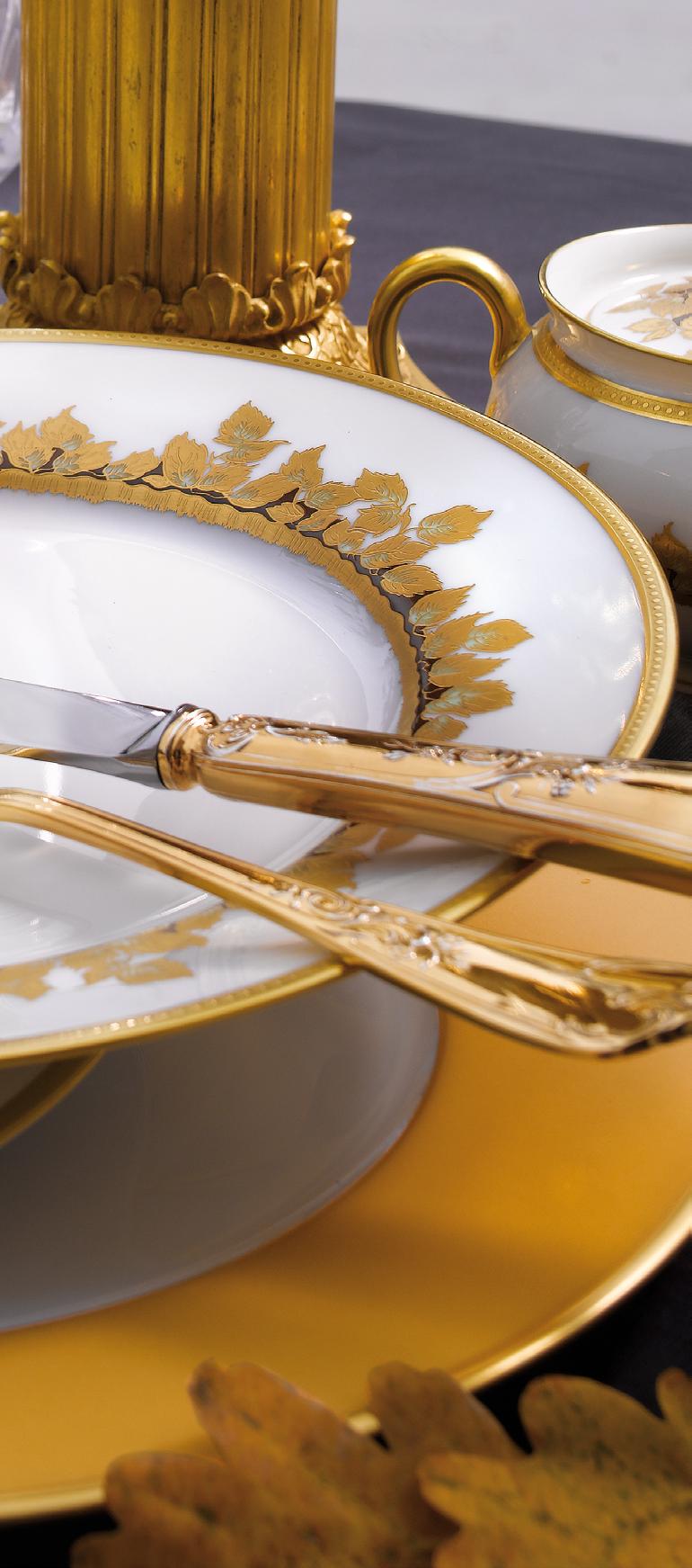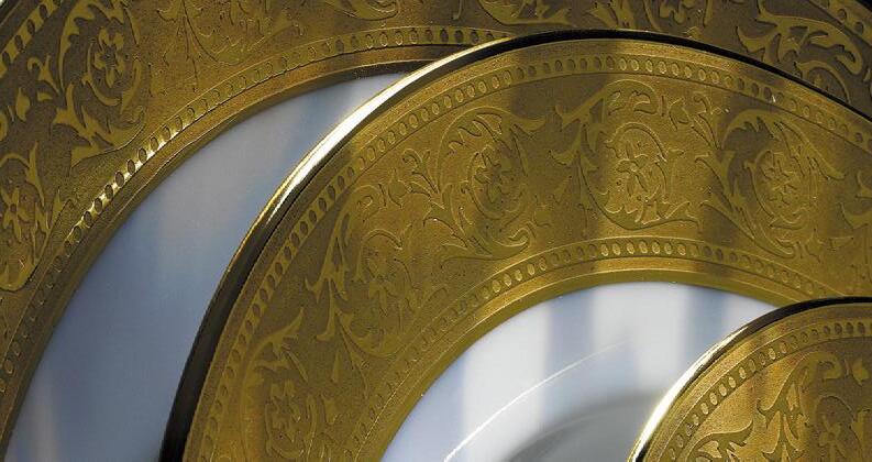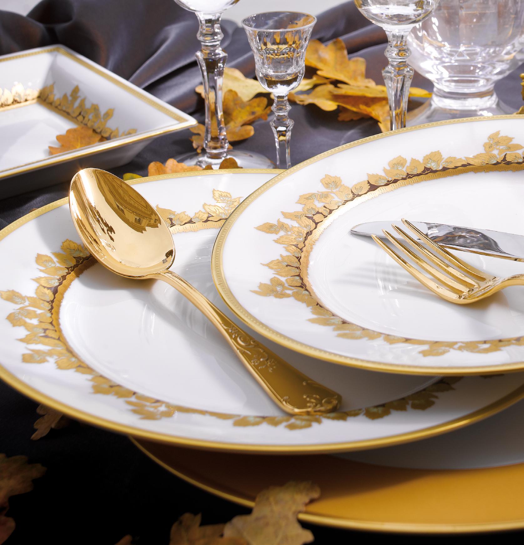 If your gold or platinum decorated service is not used regularly or if it is stored in a damp room, the gold or platinum may tarnish. The metal may also develop a patina from being rubbed by cutlery. In this case, simply polish it with a soft cloth and a few drops of a solution used for silverware maintenance. Afterwards, there is nothing better than frequent use to keep it looking its best!