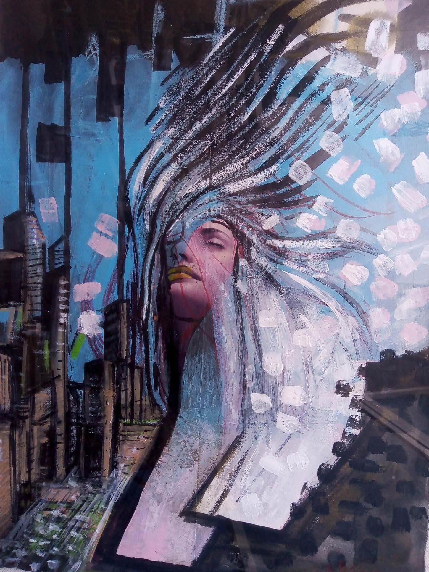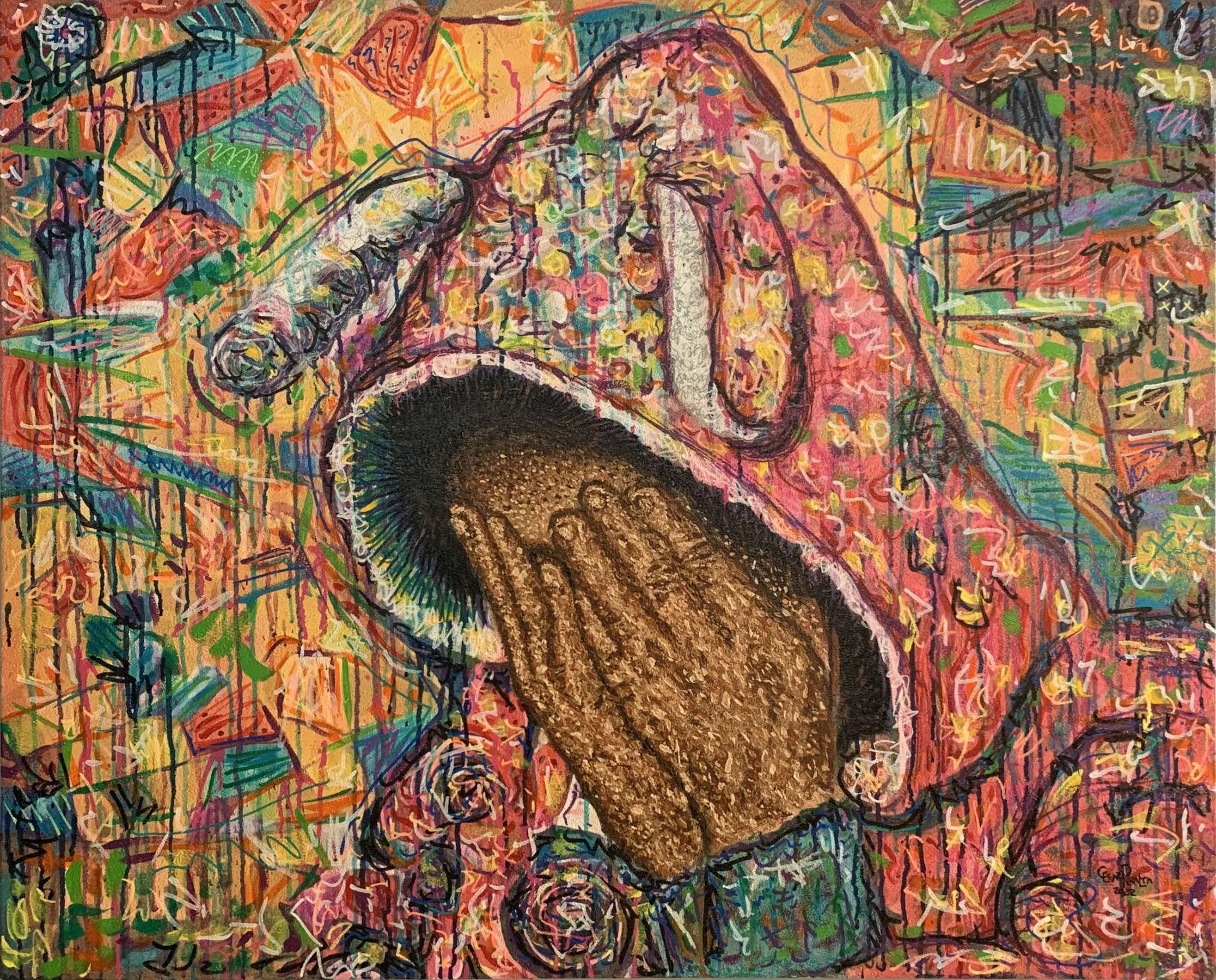 Cesar Peralta “PESADILLA TEMPRANA” Ilustracion digital impresa sobre lienzo, intervenida con acrilicos y realidad aumentada 3D firmado con certificado 90 x 120 cm (sin marco) Galería San pedro Garza Garcia