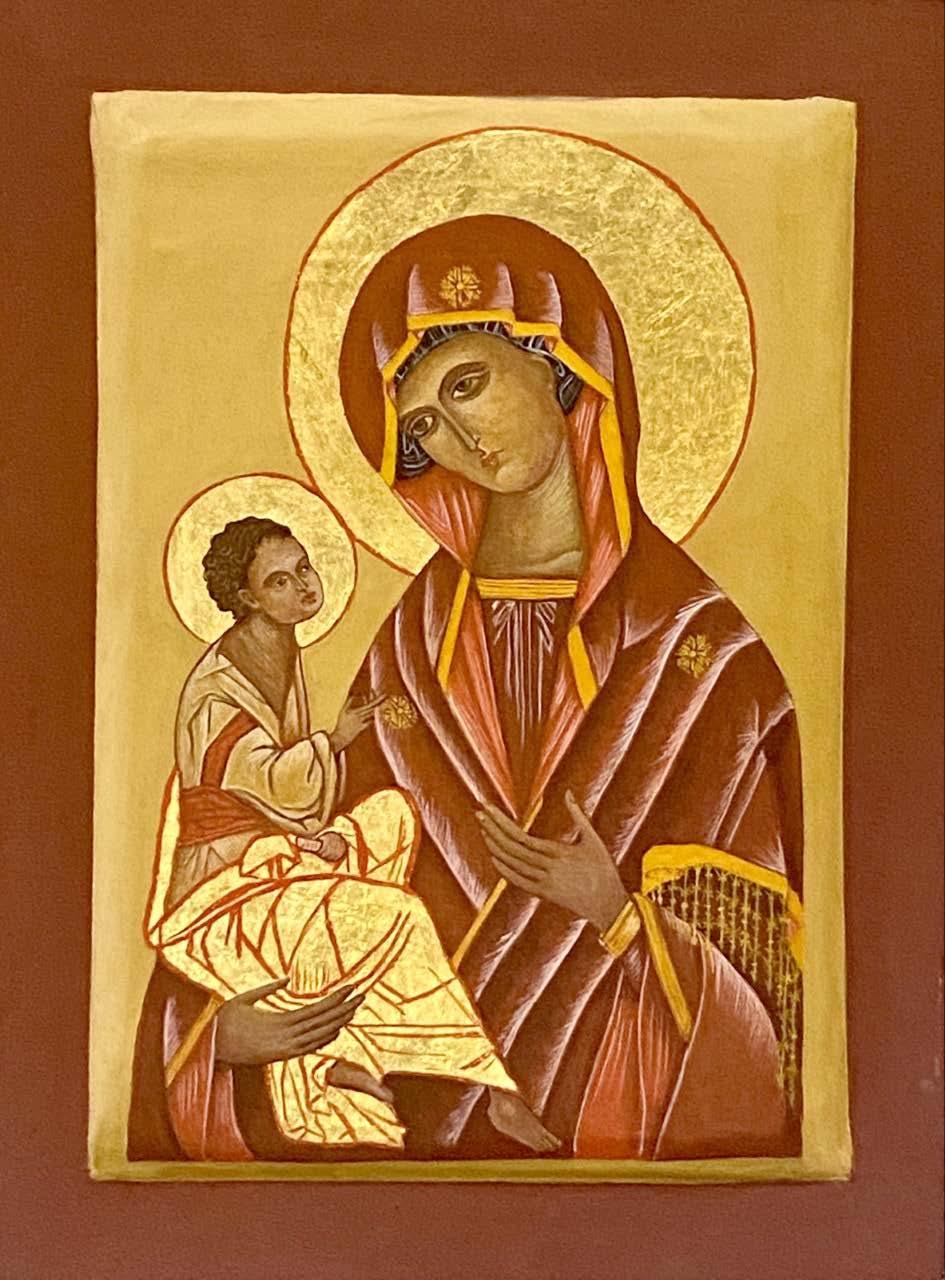 MADRE DE DIOS (DECISIS)” Temple sobre cedro rojo aureola de 24 k firmado con certificado 26.5