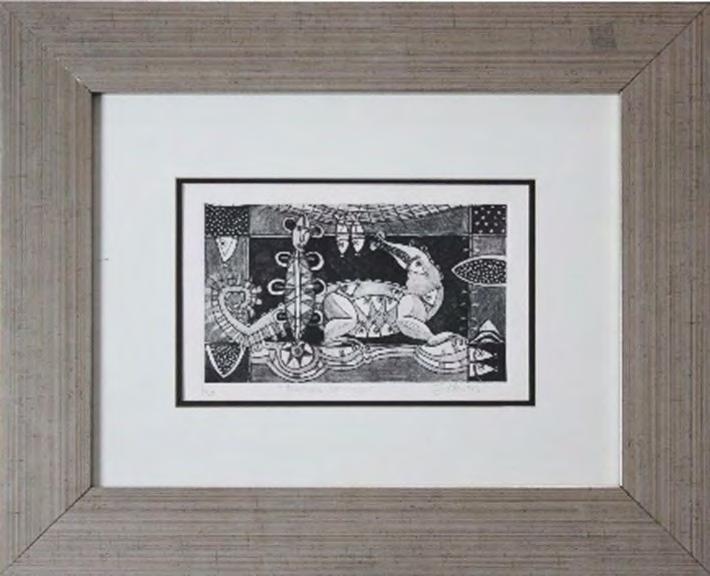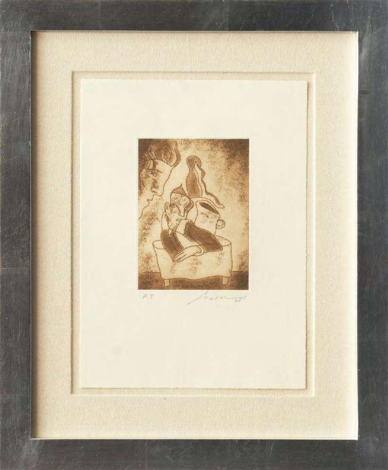 “Algunas obras pueden presentar detalles de conservación, variación ligera de medidas o color” LOTE 350 Salida: $2,000 MXN Estimado: $6,000 MXN Calderoni “LA POSE” Grabado firmado con certificado 46 x 43 cm (con marco) Galería Querétaro