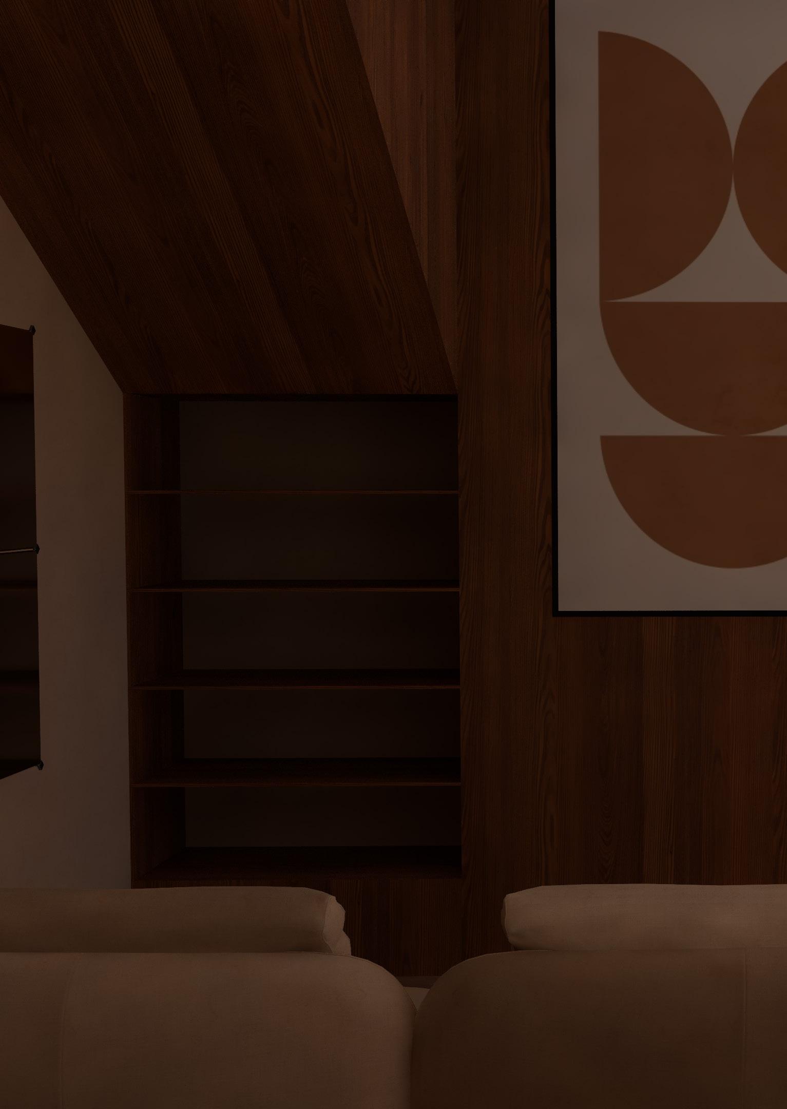 01- Laje Existente; 02- Perfil Metálico 50x115mm; 03- Suporte do Teto Falso; 04- Painel de Madeira de Cerejeira; 05- Tela de Projeção Ø90mm; 06- Peça em Madeira Maciça de Cerejeira; 07- Painel em Madeira de Cerejeira 20x1050x2850mm.
