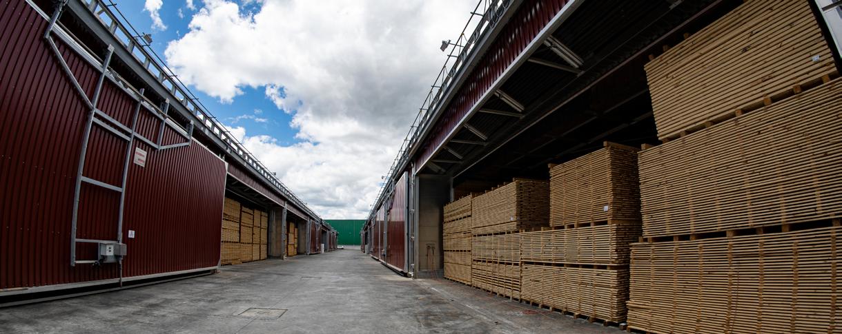 Nas estufas, os fardos de madeira são agrupados com uma única medida de madeira. Uma vez completa, a porta é fechada e o ar é aquecido até quase 80°C e movimentado através de ventiladores para que este ar quente, carregue a umidade que se encontra dentro da madeira para fora. A madeira entra com aproximadamente 50% de umidade em seu interior, e sai da estufa quando a umidade interna da madeira atingir de 8-12% de umidade. 100% da nossa produção é seca em estufas.