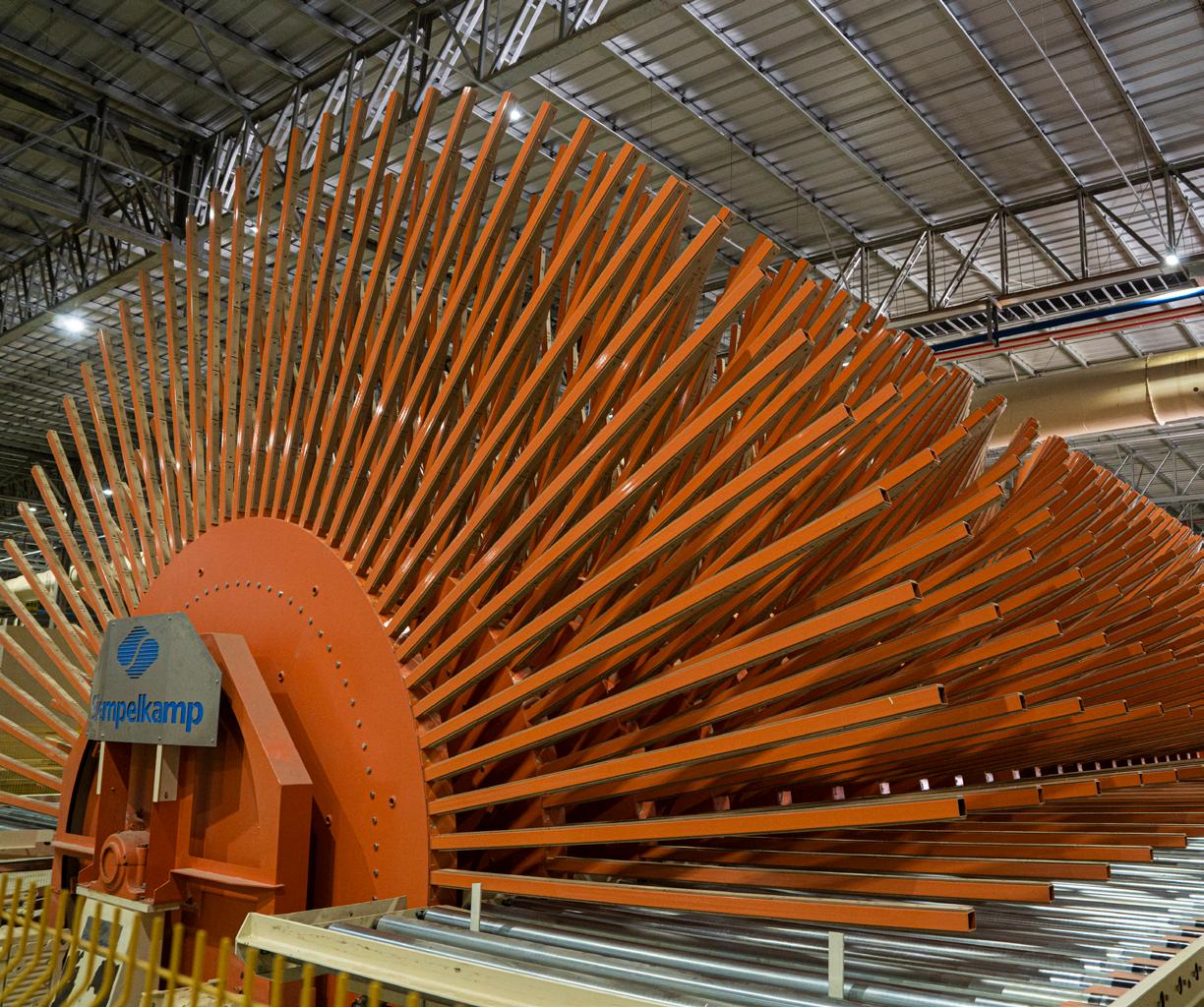 Após prensados e cortados em medida master, os painéis são unificados no virador de chapas, para resfriamento.