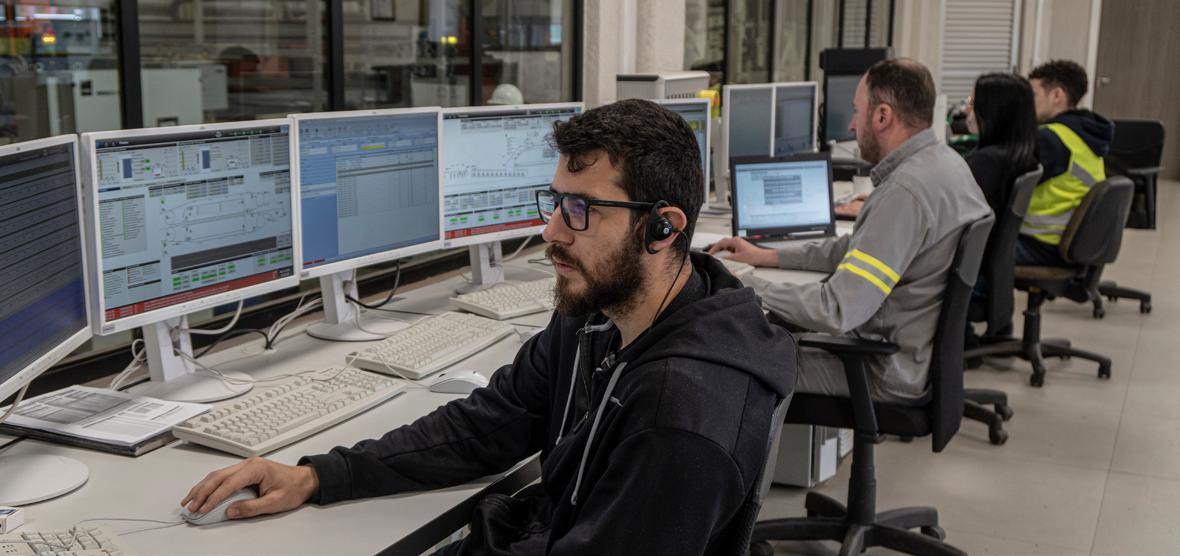 Da sala de controle, todo o processo de geração de vapor, energia, preparação de fibra e produção de painel MDF é monitorado para garantir a qualidade do produto.