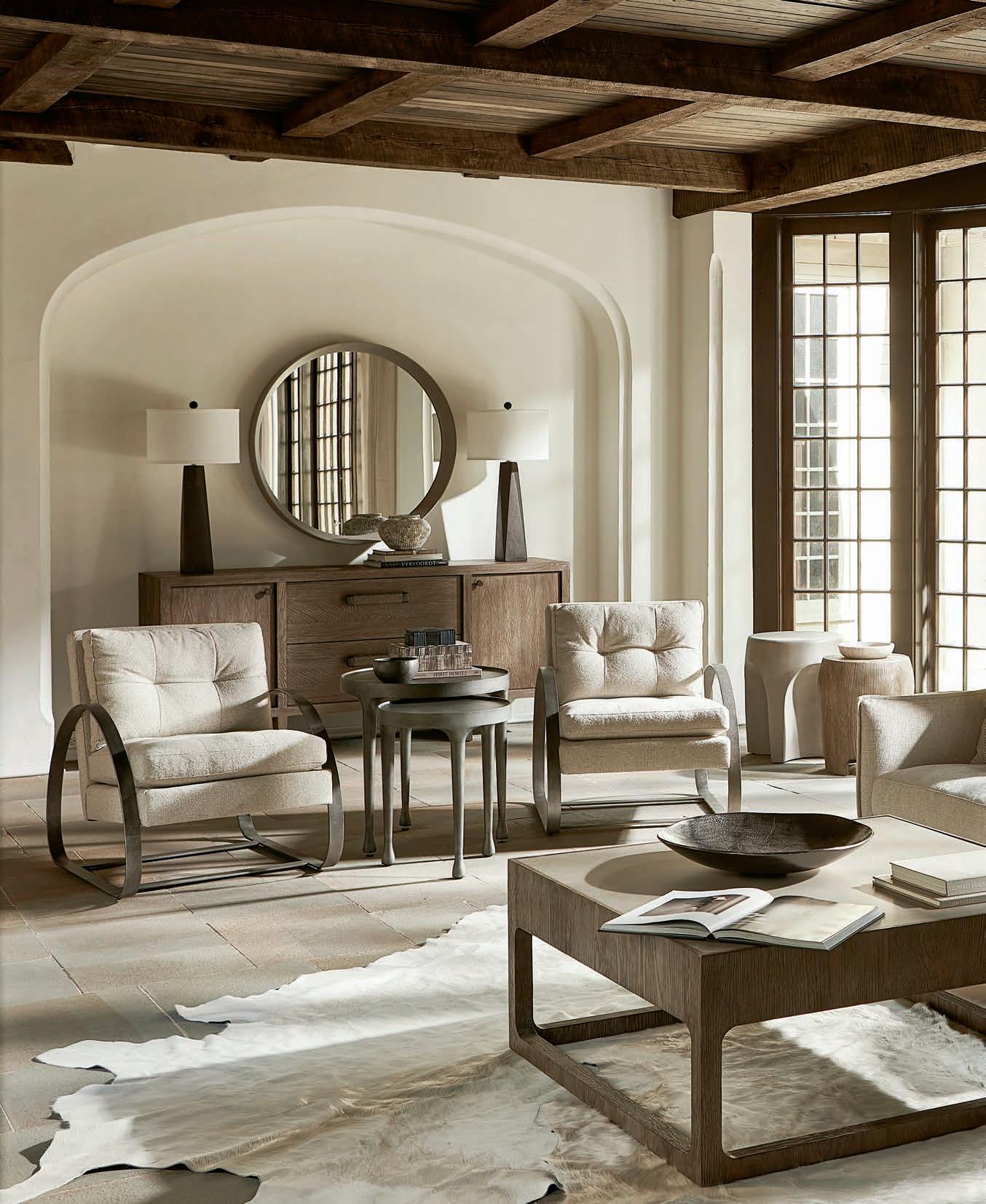 PAGES 14-15: 317132 Buffet, 317333 Mirror, 317121 Side Table, 317122 Accent Table, 317124 Side Table, 317113 Side Table, 317011 Cocktail Table, 317111 Side Table, B5023 Porter Chairs, P4817 Joli Sofa.