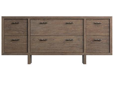 Six soft-close drawers. Rope-wrapped hardware pulls. Two-port USB charging unit on back of case. Bedrock faux finish concrete on three support panels that run front to back. Wood-veneered case and base shelf. Adjustable glides. Anti-tip kit. Playa finish. Note: Not designed to support TV and/or other media.