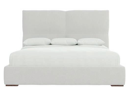 Upholstered pillow-look headboard. Fully upholstered footboard and side rails. Exposed wood feet in Playa finish. Standard with five wood slats with adjustable double center support legs. Headboard cannot be used alone. Must be ordered with footboard/side rails.