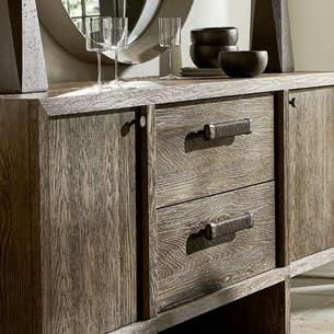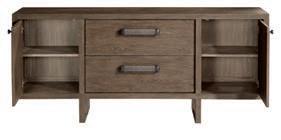 Two soft-close doors, one left and one right, and two soft-close drawers in center. Rope-wrapped hardware pulls on drawers. Behind each door is one adjustable/removable shelf. Inside the top center drawer is a brown Guardian cloth silverware insert, and the bottom drawer has a brown wrapped pad. Two leg panels run front to back. Adjustable glides. Anti-kip kit. Playa finish. Note: Not designed to support TV and/or other media.