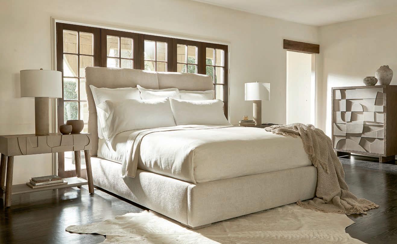 SHOWN ABOVE: 317H09/317FR09 Panel Bed ( Fabric B638 ), 317233 Nightstands, 317506 Benches ( Fabric B638 ).