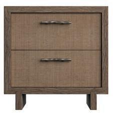 Two soft-close wood-framed drawers with inset woven panels on front. Two leg panels run front to back. Two-port USB charging unit on back. Adjustable glides. Anti-tip kit. Light Playa finish. Note: Not designed to support TV and/or other media.