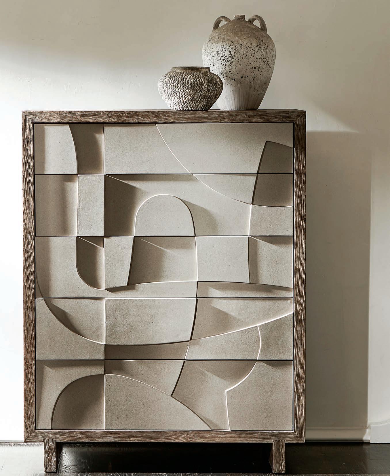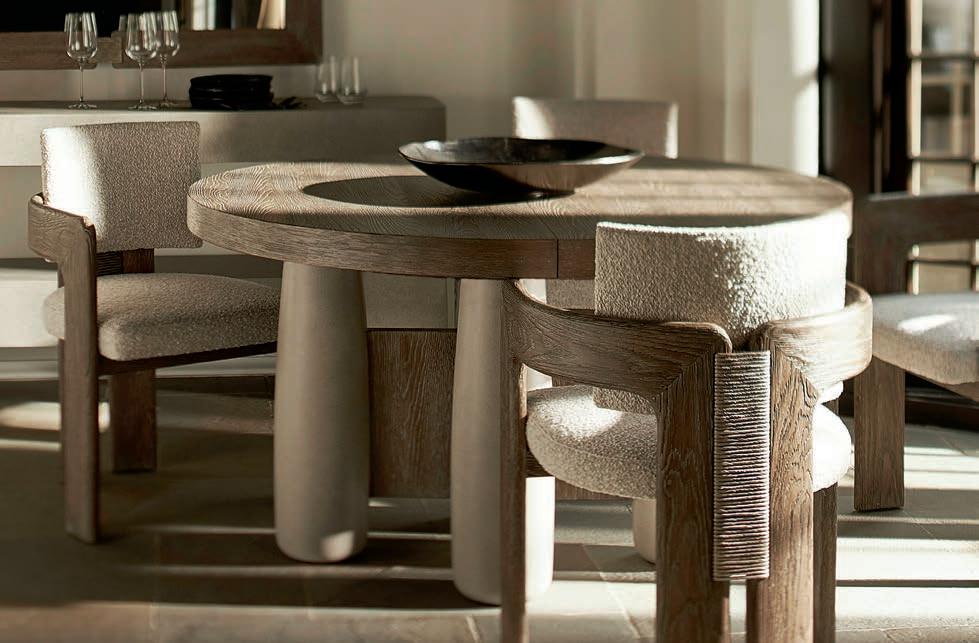 oak solids and veneers combined with twisted rope, cast concrete and dark, textural metal.