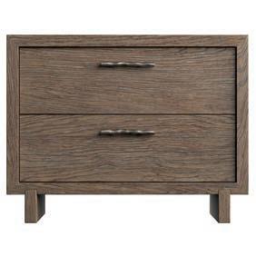 Two soft-close drawers. Rope-wrapped hardware pulls. Two-port USB charging unit on back of case. Bedrock faux finish concrete on two support panels that run front to back. Wood-veneered case and base shelf. Adjustable glides. Anti-tip kit. Playa finish. Note: Not designed to support TV and/or other media.