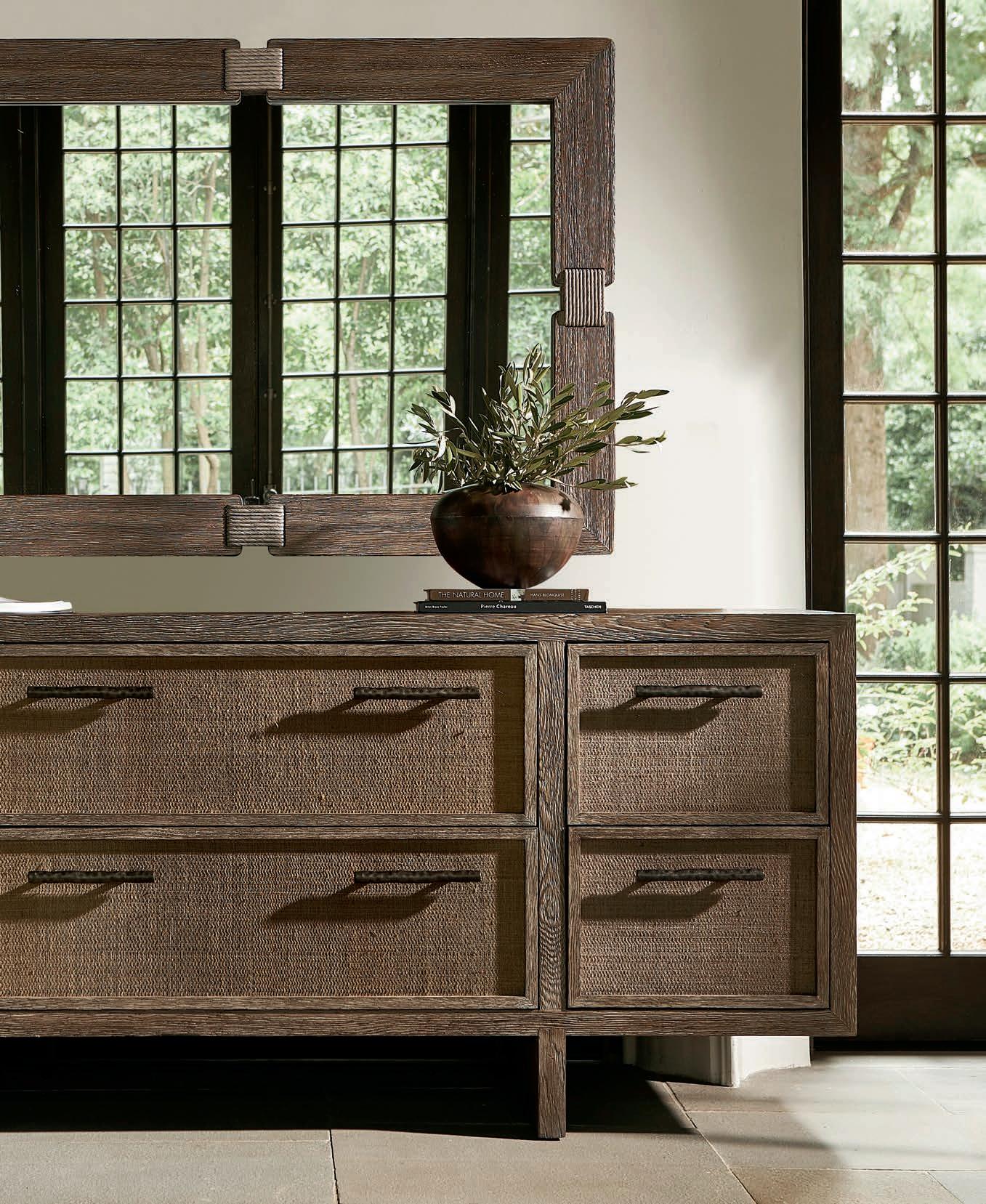 Six soft-close wood-framed drawers with inset woven panels. Two leg panels run front to back. Adjustable glides. Anti-tip kit. Light Playa finish. Note: Not designed to support TV and/or other media.