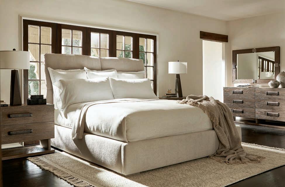 Deep wood-framed headboard and footboard with inset upholstered panel. Exposed wood feet. Footboard also functions as a bench. Standard with five wood slats with adjustable double center support legs. Playa finish. Headboard cannot be used alone. Must be ordered with footboard/side rails.