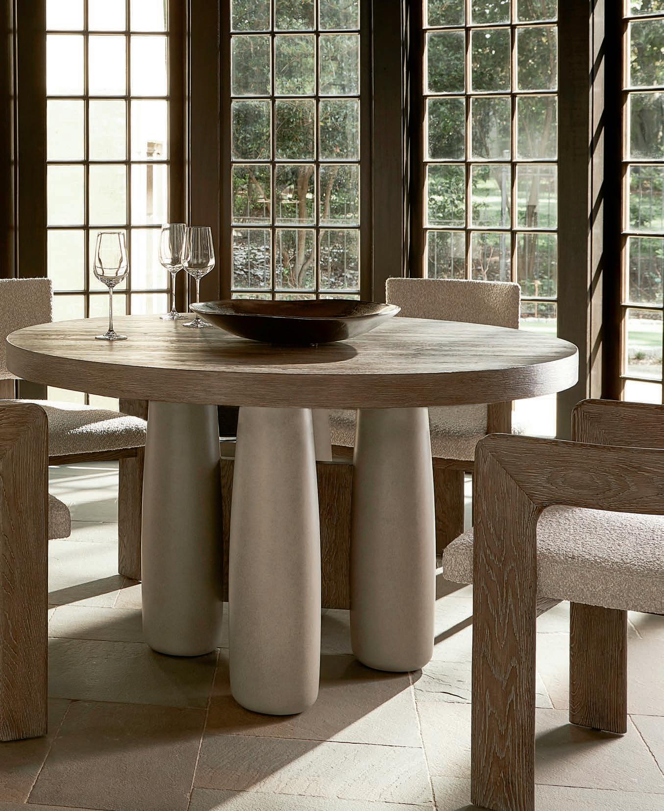 Wood table top in Playa finish with one 24" leaf. Two round pedestal bases of cast resin in Bedrock faux finish concrete. Adjustable glides.
