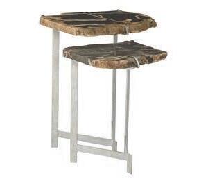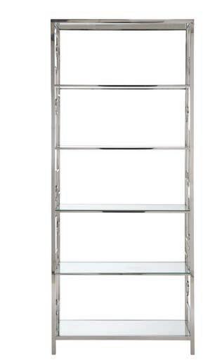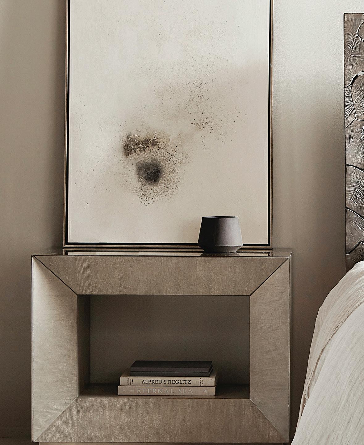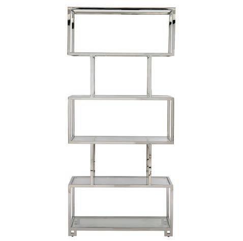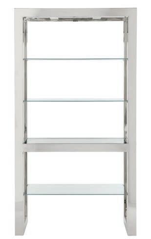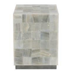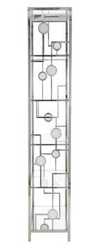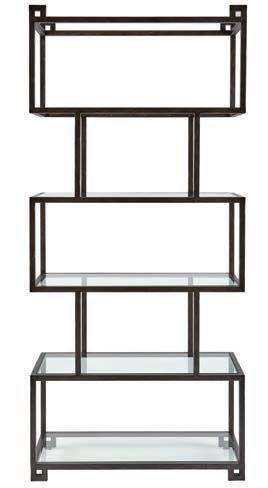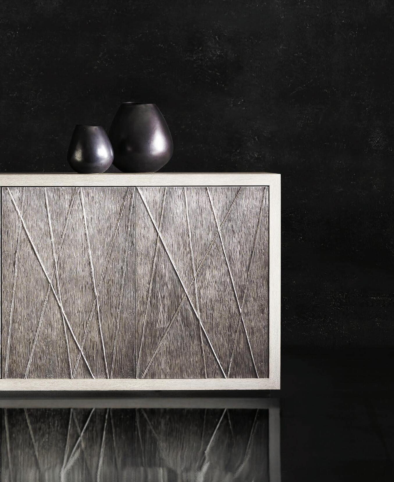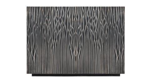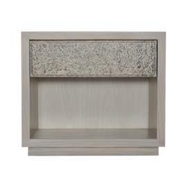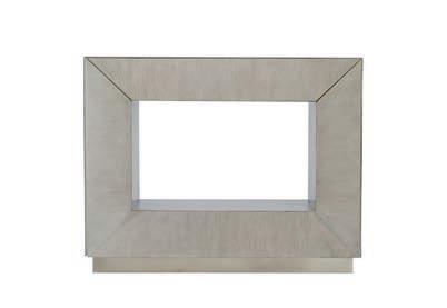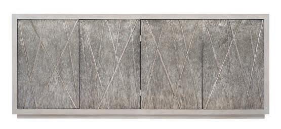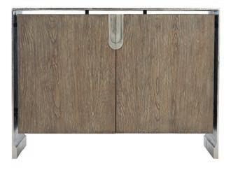 Materials/Finishes: Wire-brushed quartered pine veneers. Bone finish. Stainless Steel frame around perimeter of case in Tarnished Nickel finish.