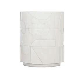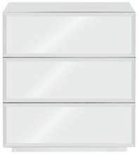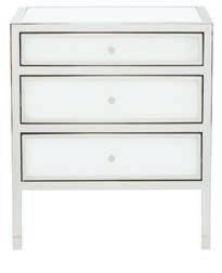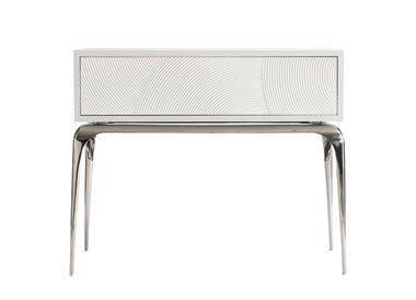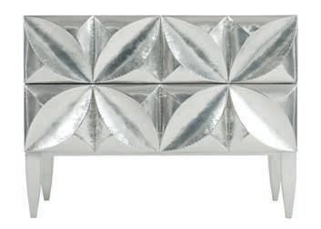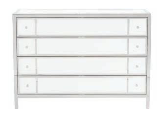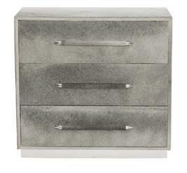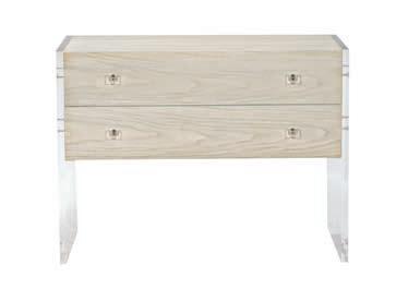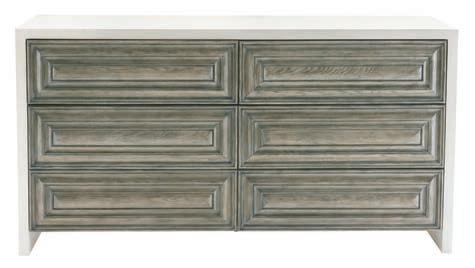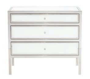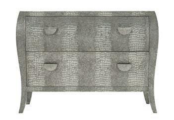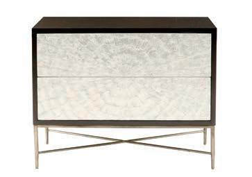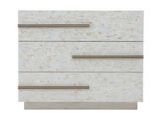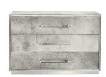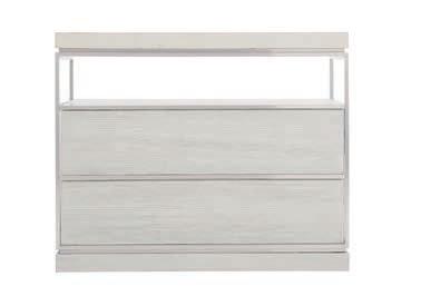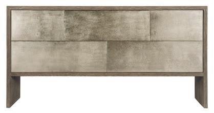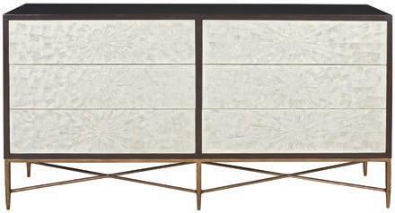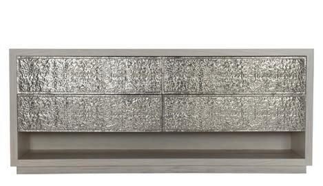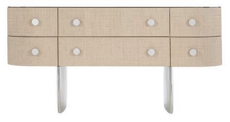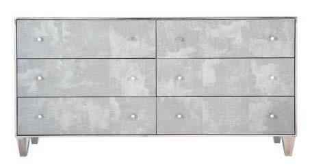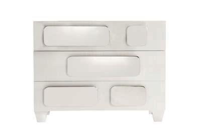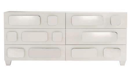 Materials/Finishes: Frosted Pearl finish on oak veneered case. Six push-to-open drawers with textured cast resin fronts. Polished Stainless Steel feet.