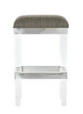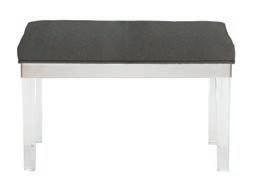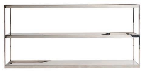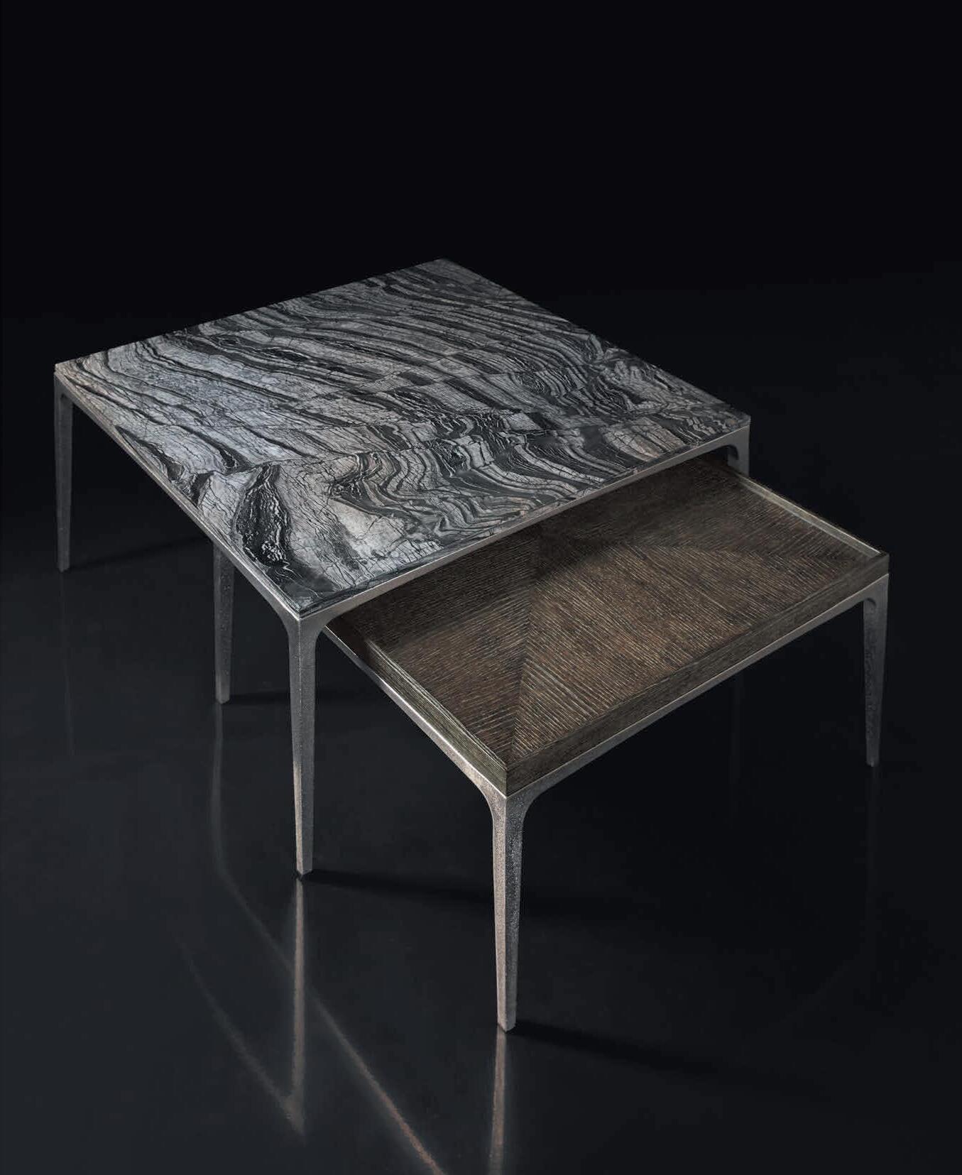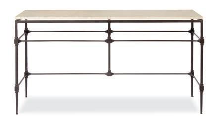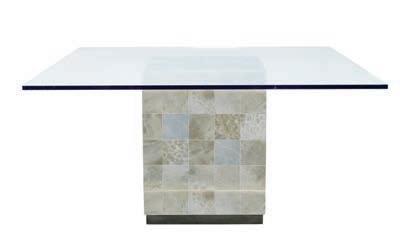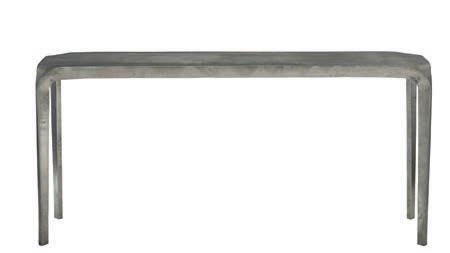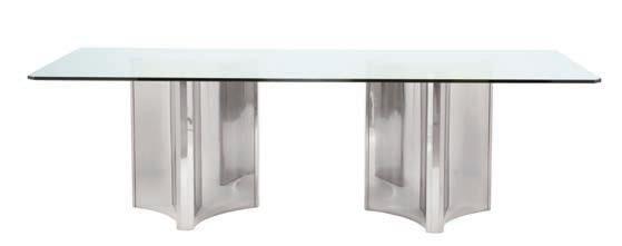 Materials/Finishes: Polished stainless steel frame. Inset grey faux vellum panels on top, side panels and drawer fronts. Removable polished stainless steel fabricated legs. Removable center metal leg.