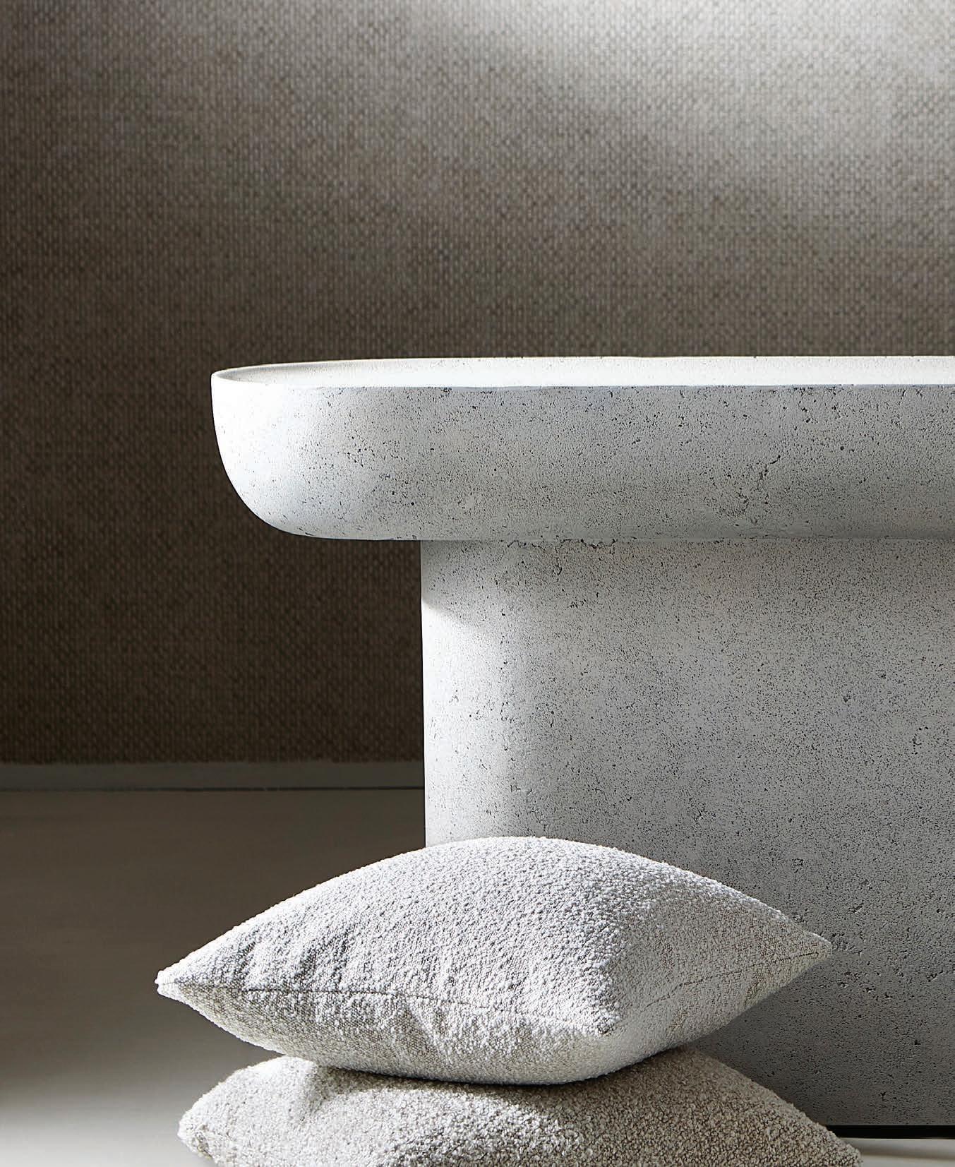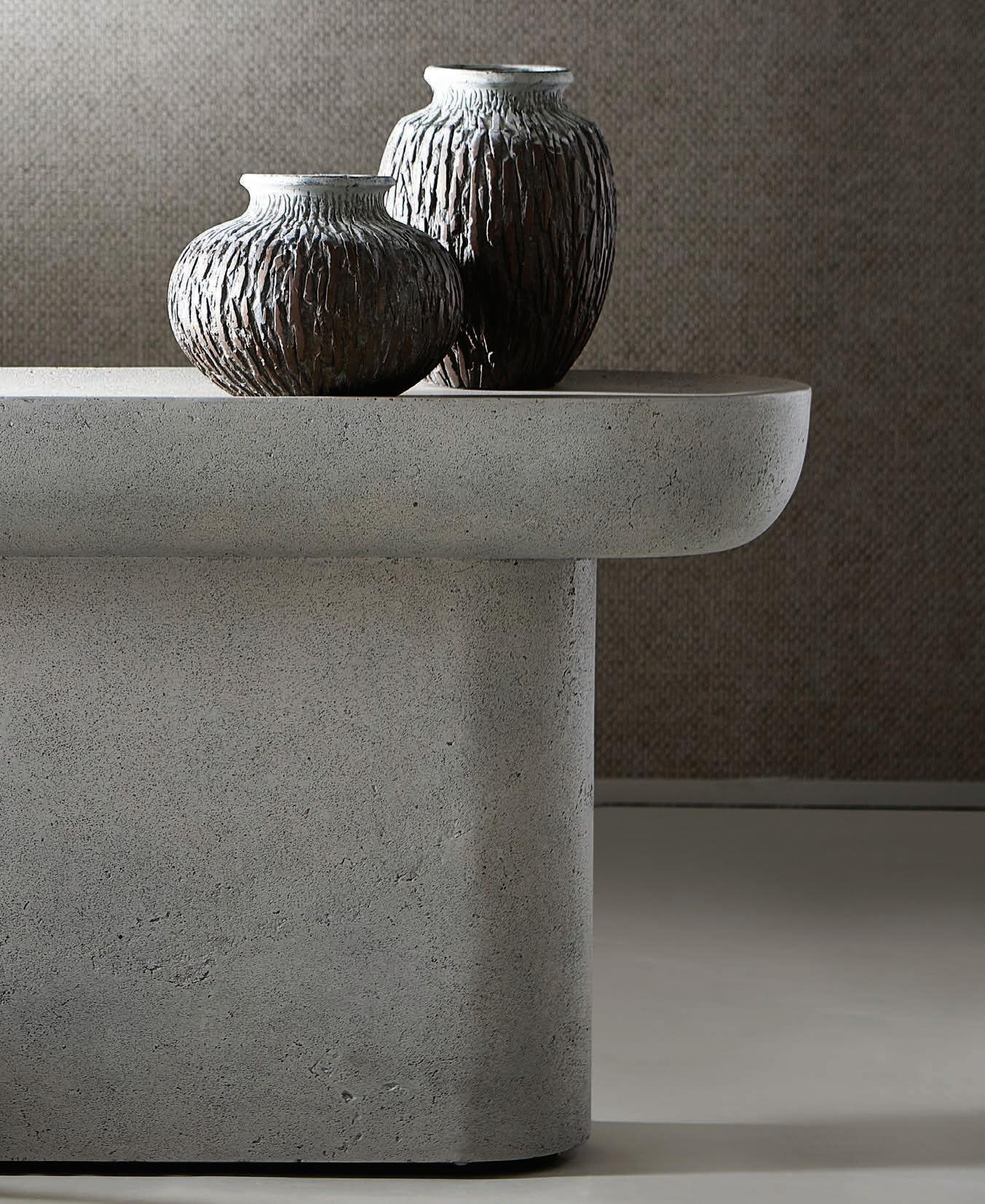 Materials/Finishes: Quartered white oak case in Flint finish. Cast concrete top in Sand Grey finish with smooth surface and textured sides. Plinth base.