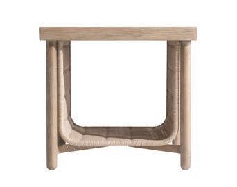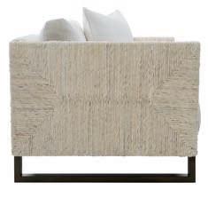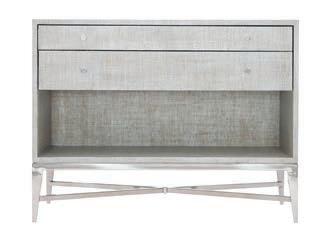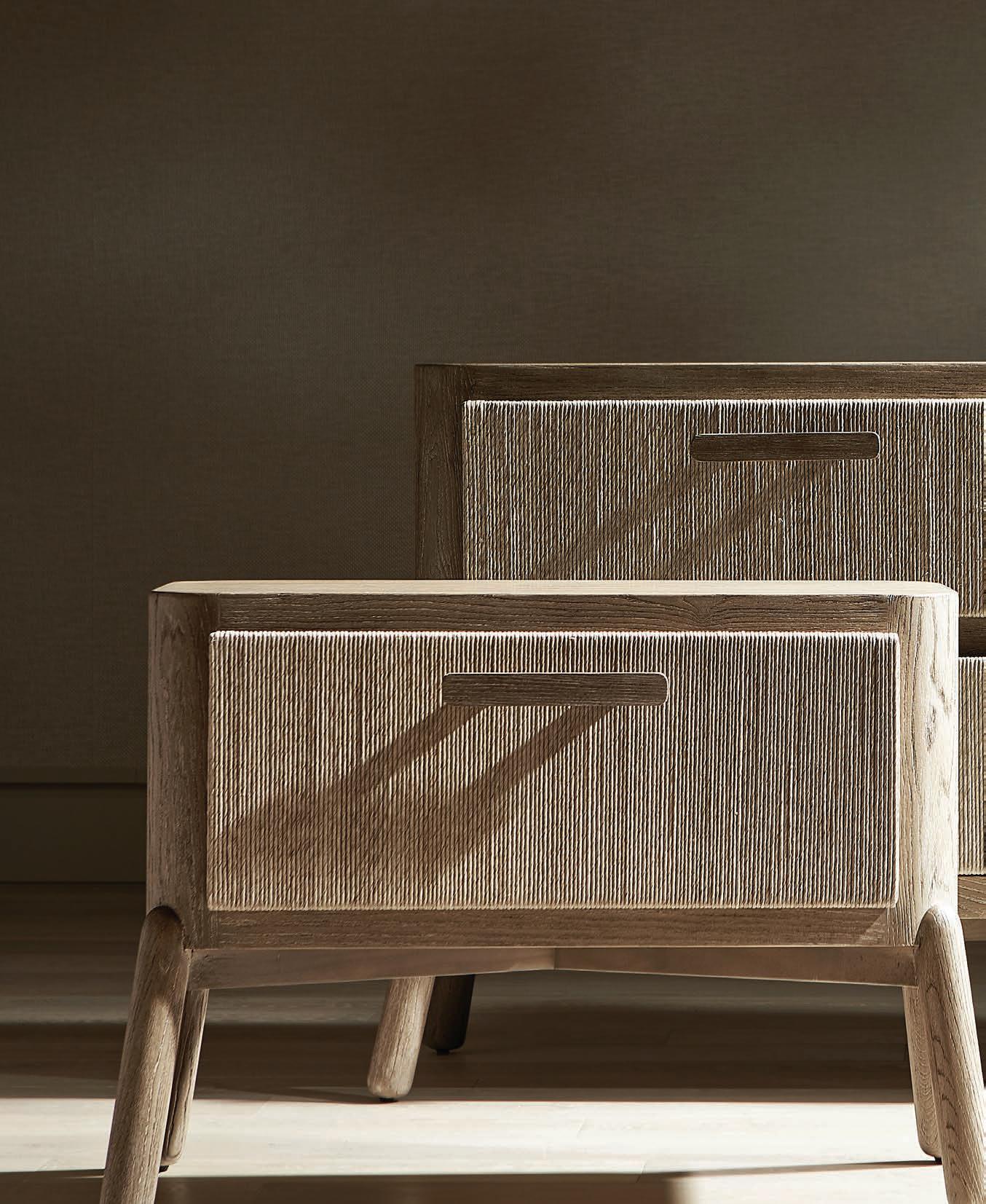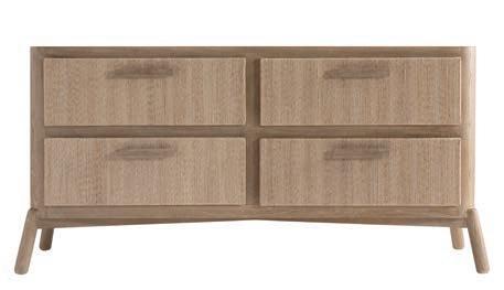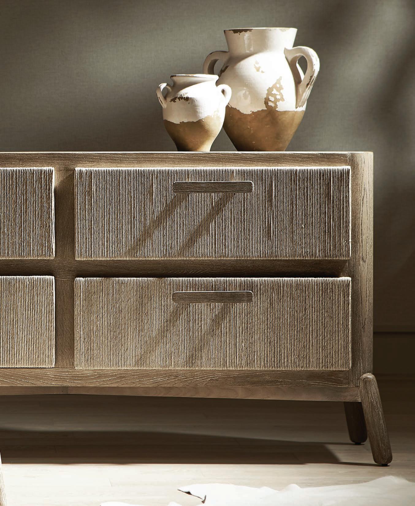 Materials/Finishes: Sandbar finish on white oak veneered case. Four soft-close drawers with twisted rope wrapped fronts. Base with "X" shaped stretchers and splayed legs.