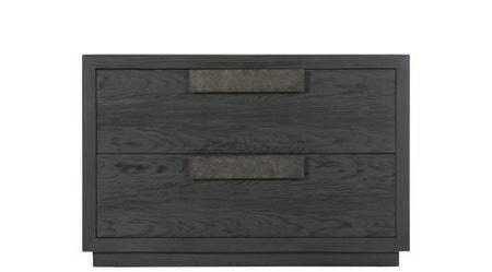 Materials/Finishes: Ebonized Pine finish. Drawers with textured cast aluminum pulls in Black Nickel finish. Plinth base.