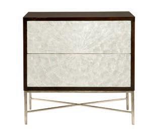 Materials/Finishes: Gmelina solids and flat cut cherry veneers in Espresso finish. Capiz shell drawer fronts. Solid steel base in Bronze finish.