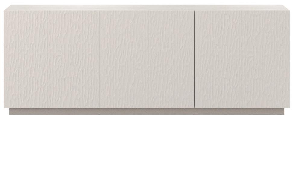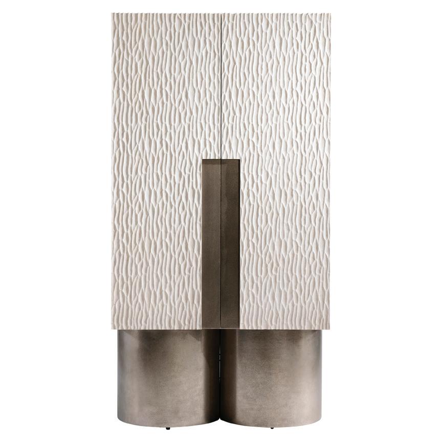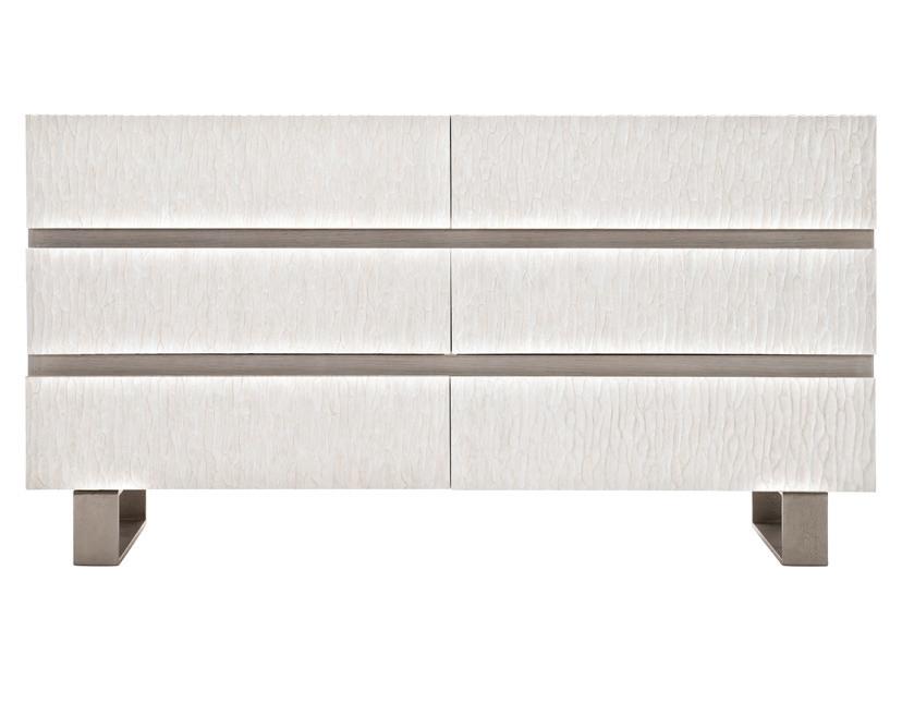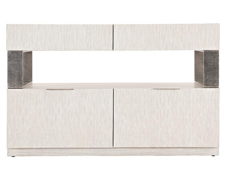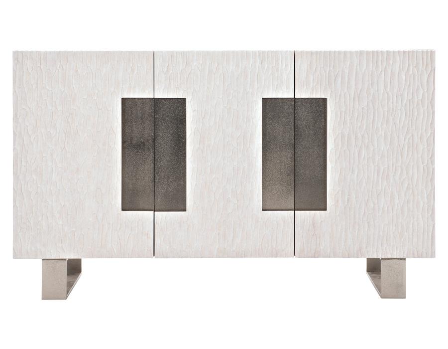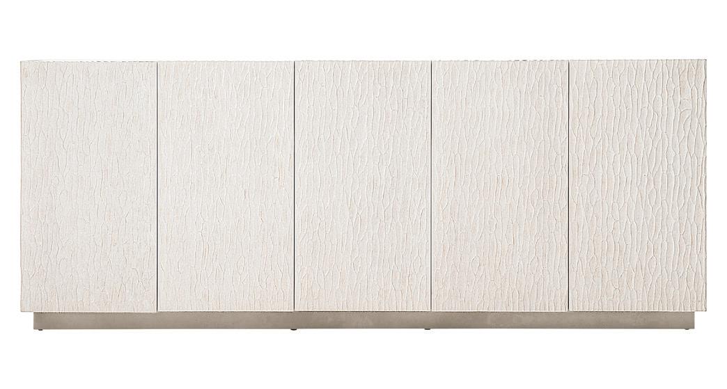 Five soft/self-close doors with cast resin overlay in chiseled pattern design. Behind left paired doors are two adjustable/removable shelves, ventilation holes and one grommet with cover in hack panel. Behind center door are two adjustable/removable shelves. Behind right paired doors are one fixed shelf, one soft-close drawer with hand cutout, ventilation holes and two grommet holes with covers in hack panel. Adjustable glides. Anti-tip kit. Cast aluminum plinth base in Shiny Nickel finish. Weathered Bone finish.
