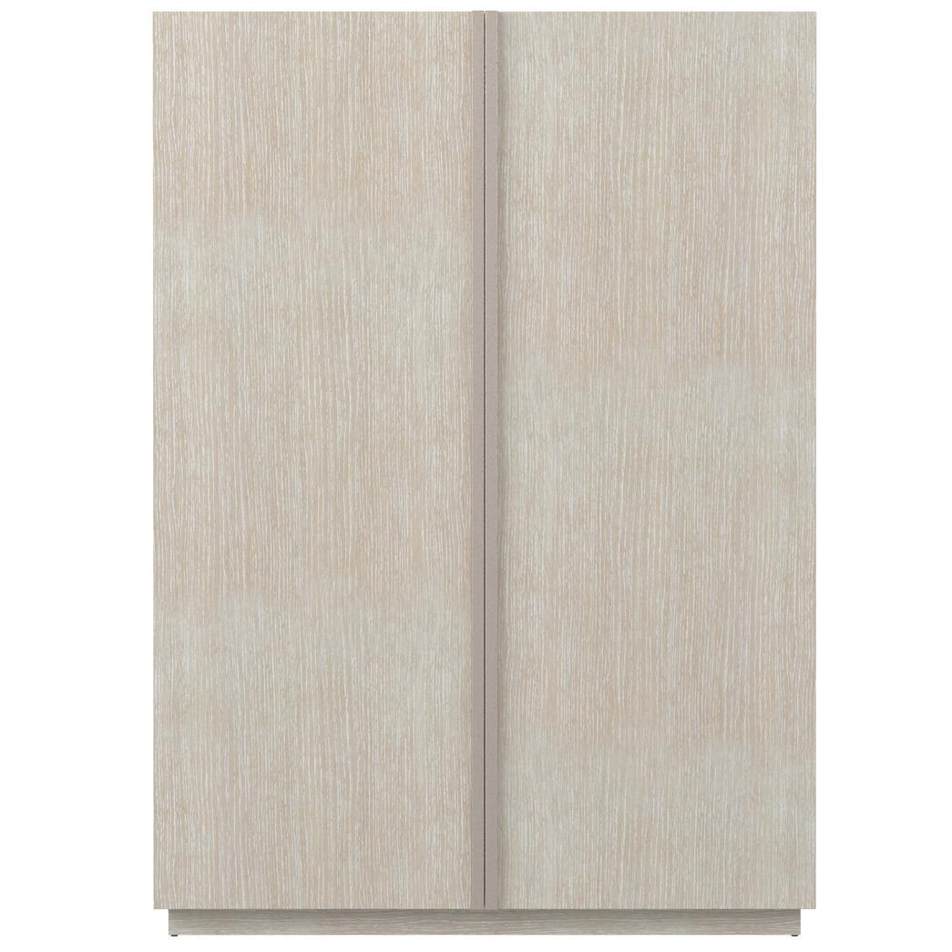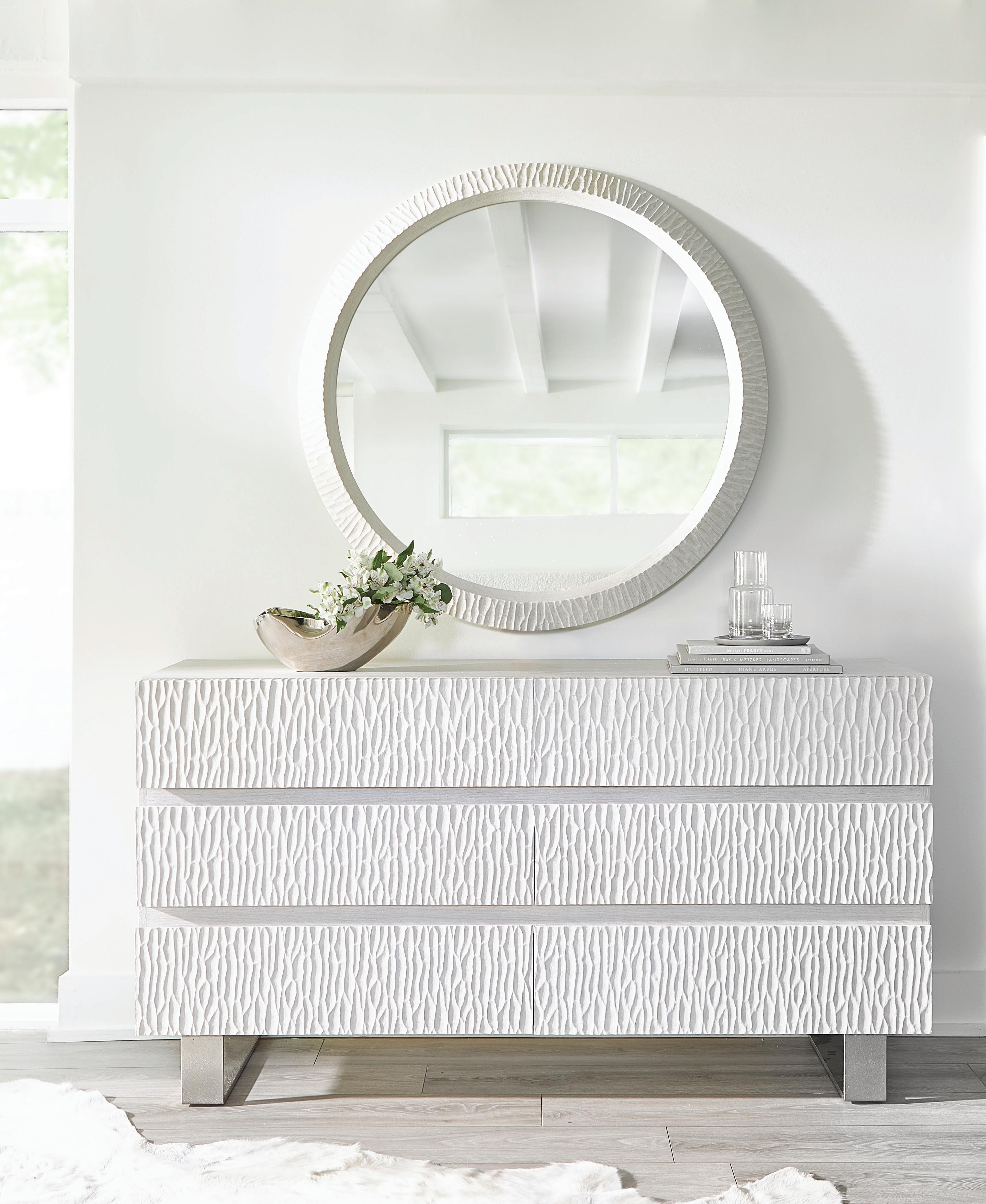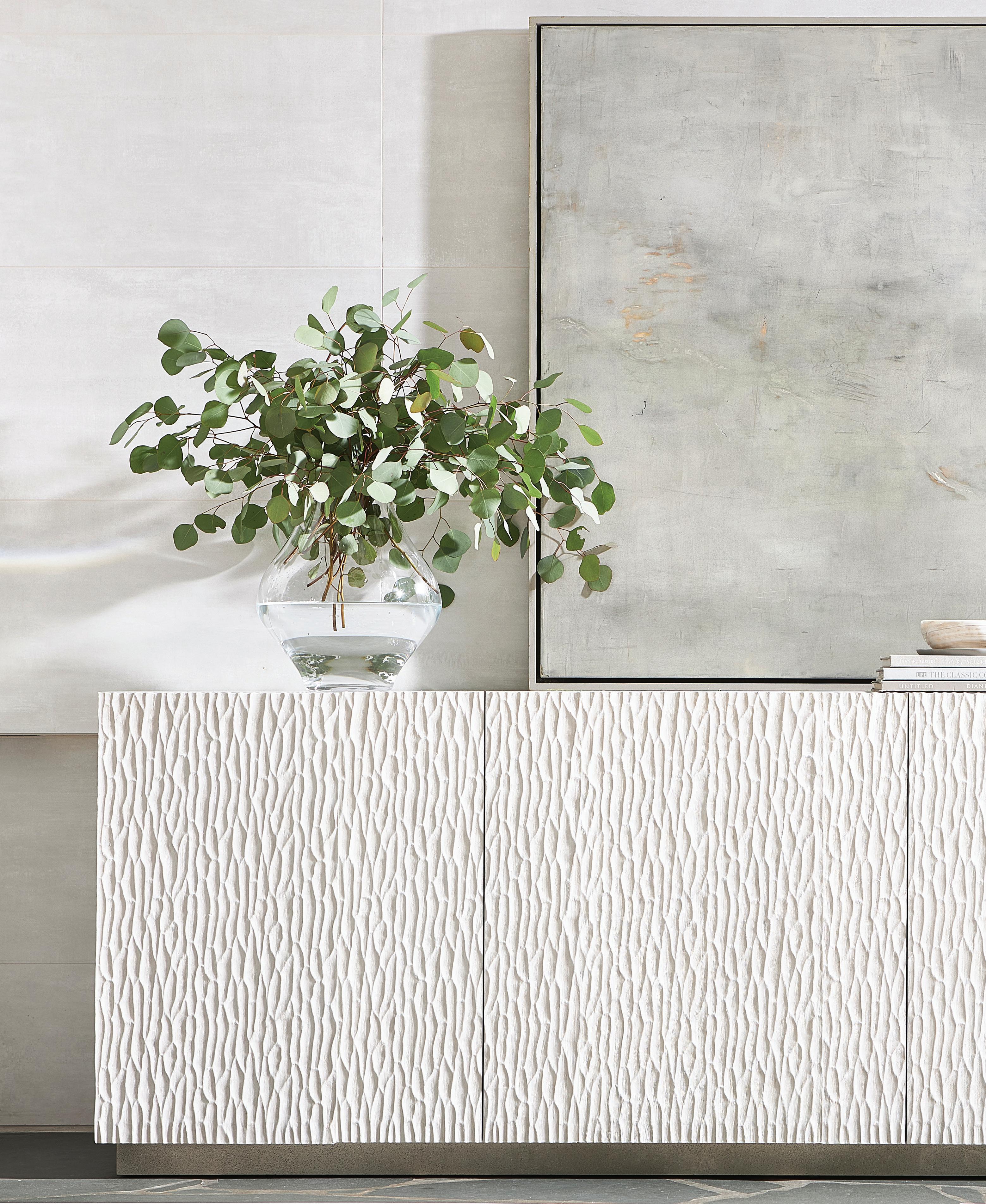 Five soft/self-close doors with cast resin overlay in chiseled pattern design. Behind left paired doors are two adjustable/removable shelves, ventilation holes and one grommet with cover in hack panel. Behind center door are two adjustable/removable shelves. Behind right paired doors are one fixed shelf, one soft-close drawer with hand cutout, ventilation holes and two grommet holes with covers in hack panel. Adjustable glides. Anti-tip kit. Cast aluminum plinth base in Shiny Nickel finish. Weathered Bone finish.